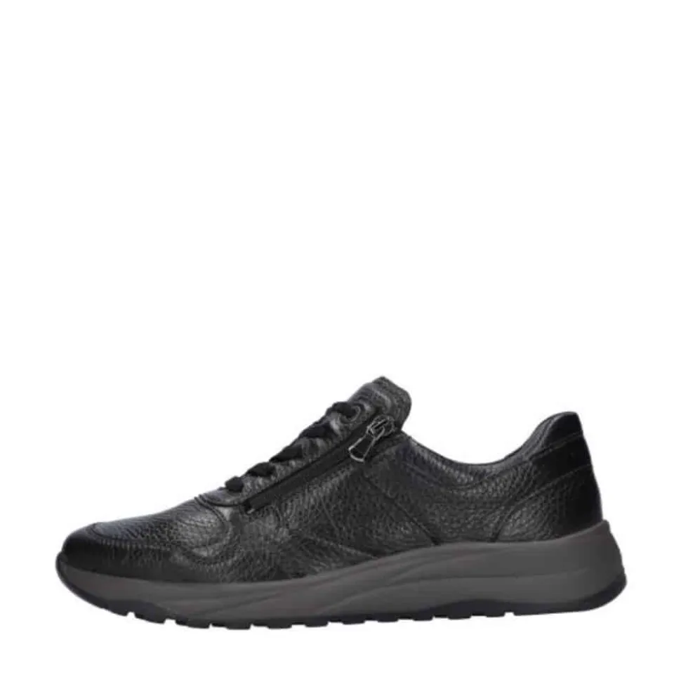 Waldläufer sneakers til dame i sort. Disse sneakers i sort skind kombinerer praktiske detaljer med høj komfort. Modellen er udstyret med snørebånd og to lynlåse, så du nemt kan få dem af og på. Indersålen i blødt skind kan tages ud og giver god støtte dagen igennem. Med ekstra bredde (M) får du fleksibilitet til foden, og ydersålen med mønster giver øget skridsikkerhed.