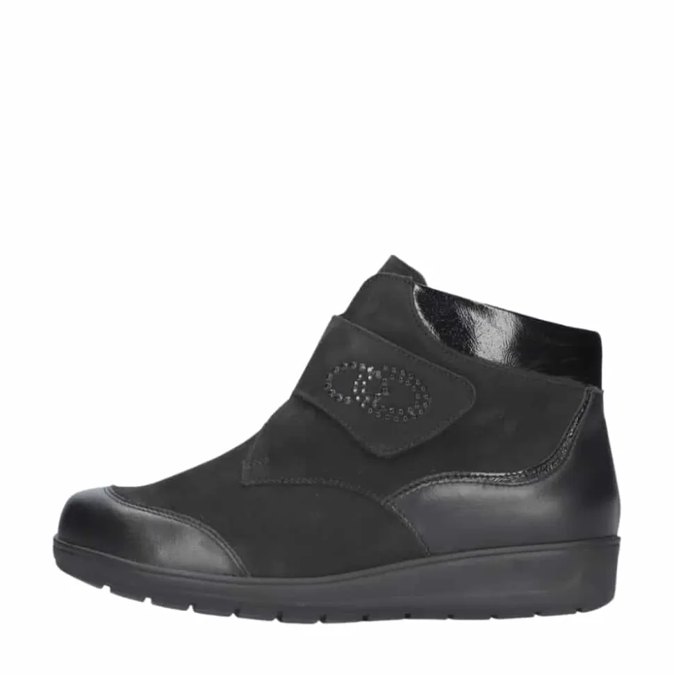Waldläufer støvle til dame i sort. En stilfuld støvle i sort med elegante detaljer og en overdel i 100% skind, der giver et moderne og feminint look. Støvlen er udstyret med en praktisk velcrorem, som gør det nemt at justere pasformen og tage støvlen af samt på. Indvendigt finder du en blød, udtagelig indersål med ekstra bredde M samt en varm foring, der holder fødderne lune. Ydersålen er solid og mønstret for at give øget stabilitet og skridsikkerhed.