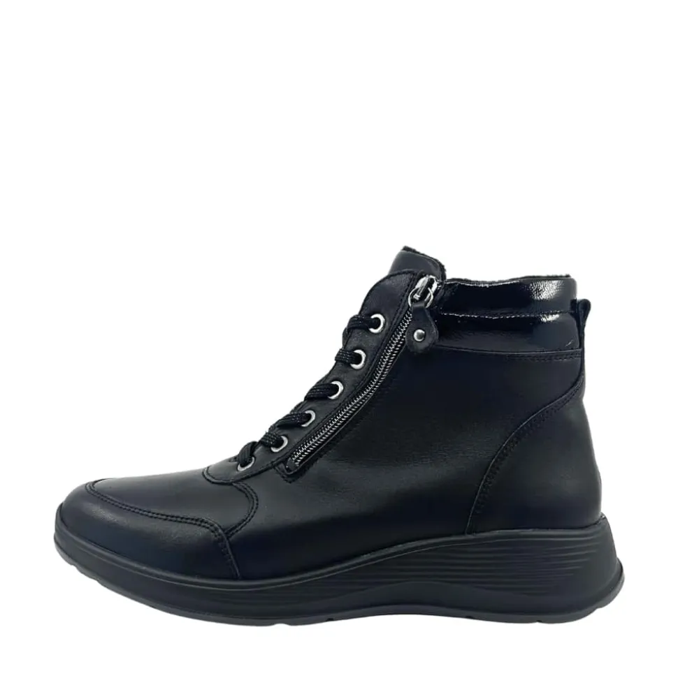 Waldläufer støvle til dame i sort. En stilfuld støvle i sort med elegante lakdetaljer, der giver et moderne og feminint udtryk. Overdelen er fremstillet i 100% skind og er udstyret med to lynlåse og snørebånd, som gør støvlen nem at få på. Indvendigt finder du en blød, udtagelig indersål med ekstra bredde K for optimal komfort samt en varm foring, der holder fødderne lune. Ydersålen er robust og har et mønster, som giver god stabilitet og skridsikkerhed.