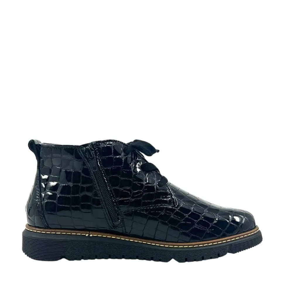 Waldläufer støvle til dame i sort lak. Denne sorte støvle skiller sig ud med sin lakoverdel og det stilfulde krokomønster, som giver designet et moderne touch. Overdelen i 100% skind er udstyret med snørebånd og lynlås, hvilket gør støvlen nem at få på. Indvendigt er der en blød, udtagelig indersål med ekstra bredde K for en rummelig pasform og en let foring, der holder fødderne lune og komfortable. Ydersålen er robust og mønstret for at give øget skridsikkerhed og stabilitet i hvert skridt.
