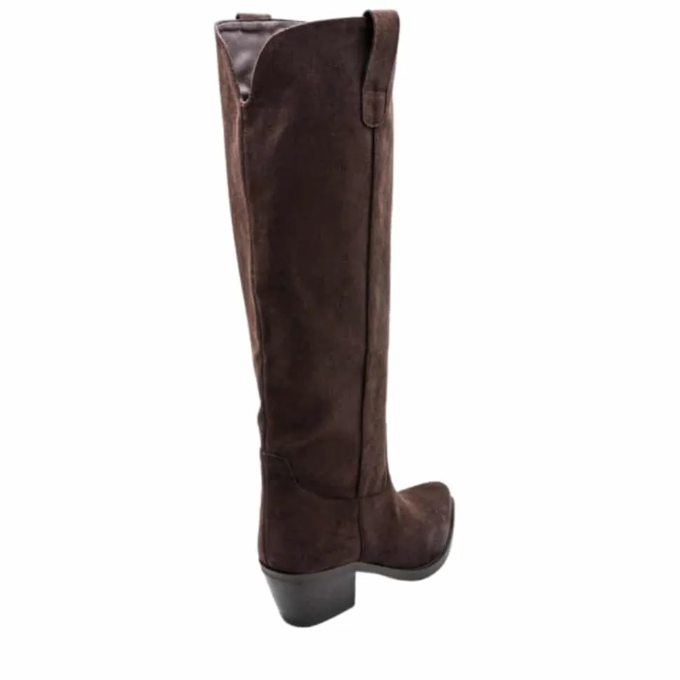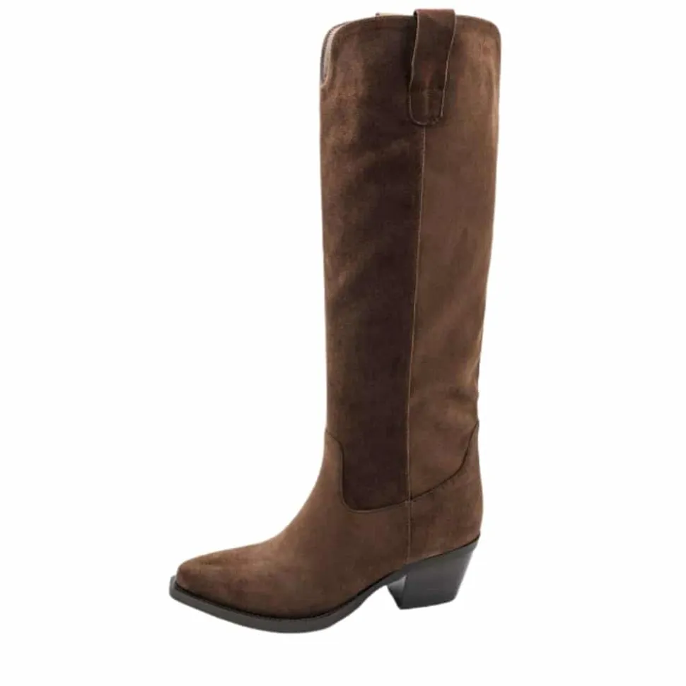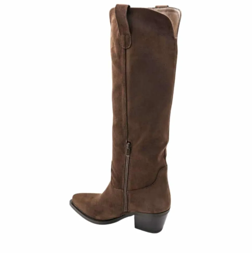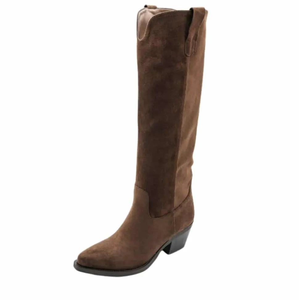 Amour lang støvle til dame i brun. Moderne støvle i brun med langt skaft og spids snude, der giver et elegant og stilfuldt udtryk. Den funktionelle lynlås på indersiden gør det nemt at tage støvlen af og på. Indvendigt sørger en blød indersål for komfort, mens blokhælen fuldender designet med et feminint løft.