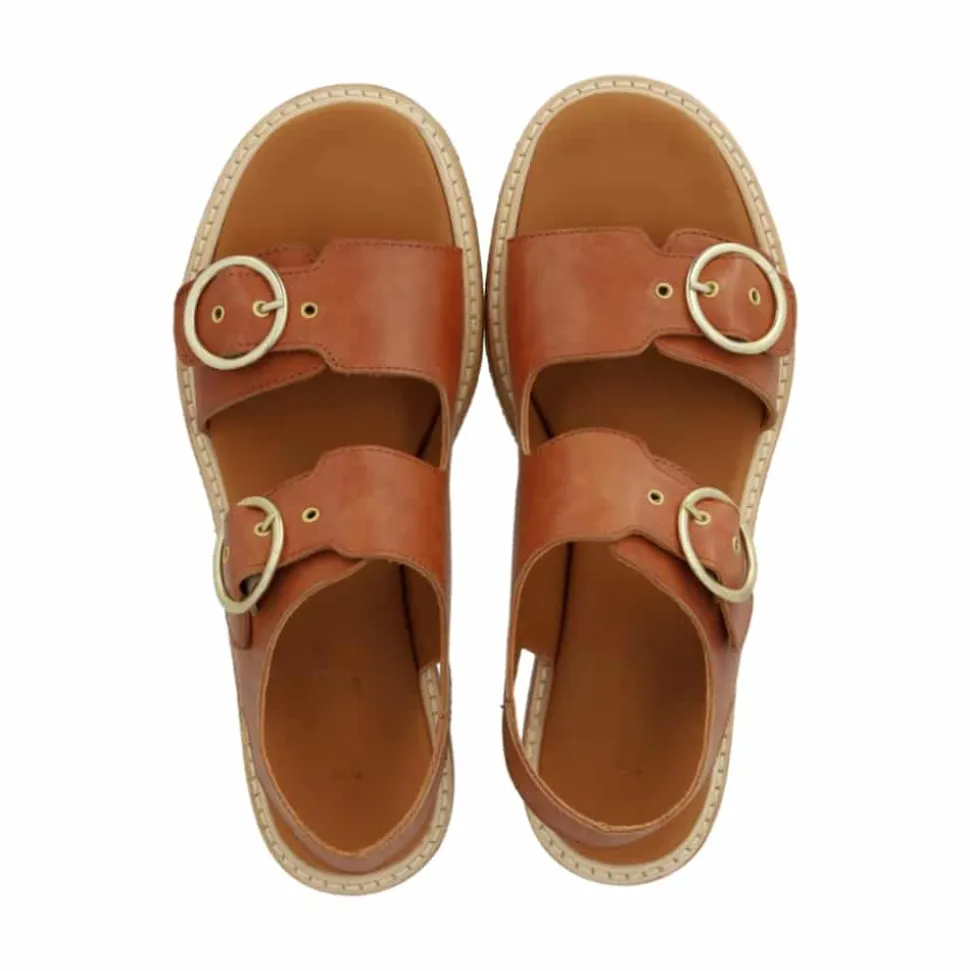 Angulus sandal til dame i cognac. Elegant sandal i en varm brun farve med sofistikerede detaljer. Sandalen er fremstillet i 100% skind og har to justerbare remme med gyldne spænder, som giver et luksuriøst og eksklusivt udseende. Den bløde indersål af skind sikrer fantastisk komfort hele dagen. Hælen på ca. 3 cm giver et stilfuldt løft, mens ydersålen i rågummi giver fremragende støtte og skridsikkerhed.