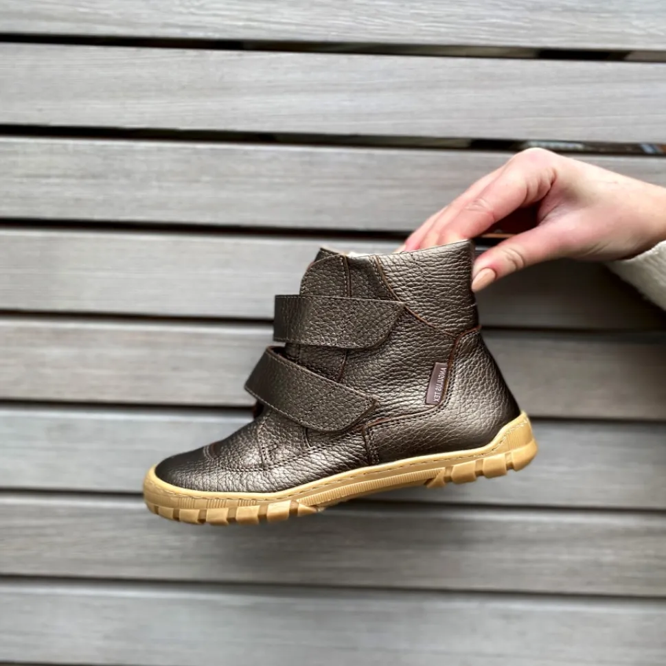 Angulus støvle i metallic til børn. Fast hælkappe for maksimal støtte. Produceret i skind og med blød gummisål. Mål altid barnets fod inden du køber, så du får købt den rigtige størrelse. Vi anbefaler et voksetillæg på 1-1,2 cm. Skoen har Angulus-Tex og er derfor kraftig vandafvisende.