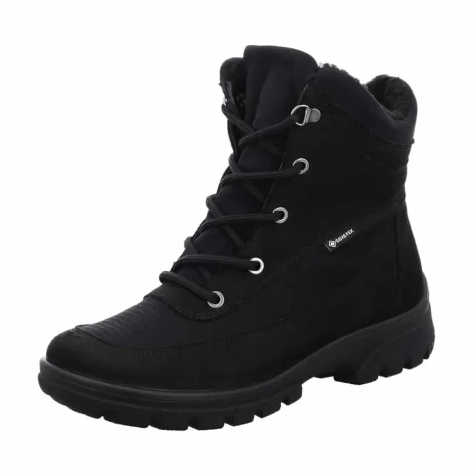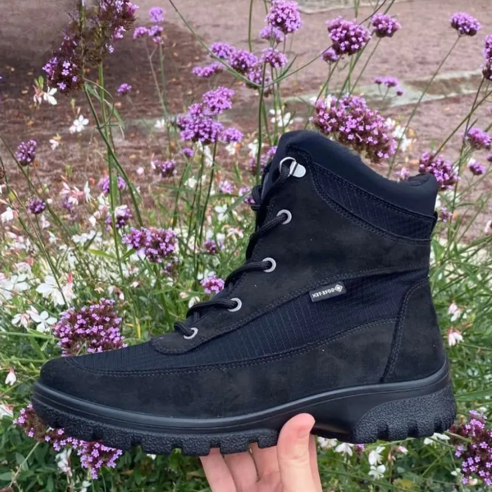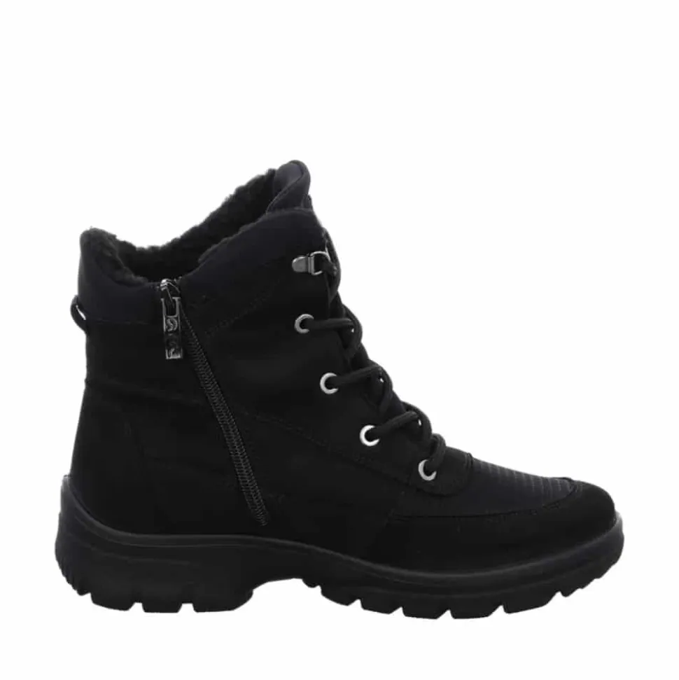 Ara vinterstøvle til dame i sort. Dårligt vejr er ingen hindring med denne støvle fra Ara. Udstyret med en vandtæt og åndbar GoreTEX membran holder den dine fødder tørre, mens det bløde varme foer sikrer, at de forbliver behageligt varme. Støvlen er lavet af robust, vedligeholdelsesvenligt syntetisk materiale, hvilket gør den let at bære. Den praktiske lynlås gør det nemt at tage støvlen på, og snørebåndene med store metaløjer giver en stilfuld detalje og mulighed for optimal tilpasning. Blød polstring omkring skaftet forhindrer ubehagelige trykpunkter, og den innovative HighSoft teknologi giver en blød, dæmpet gang. Fodsengen er blødt polstret og beklædt med frotté af bambus, der holder fødderne varme og absorberer fugt effektivt. Fodbedet kan nemt udskiftes med egne indlæg, og den skridsikre sål sikrer et godt greb.
