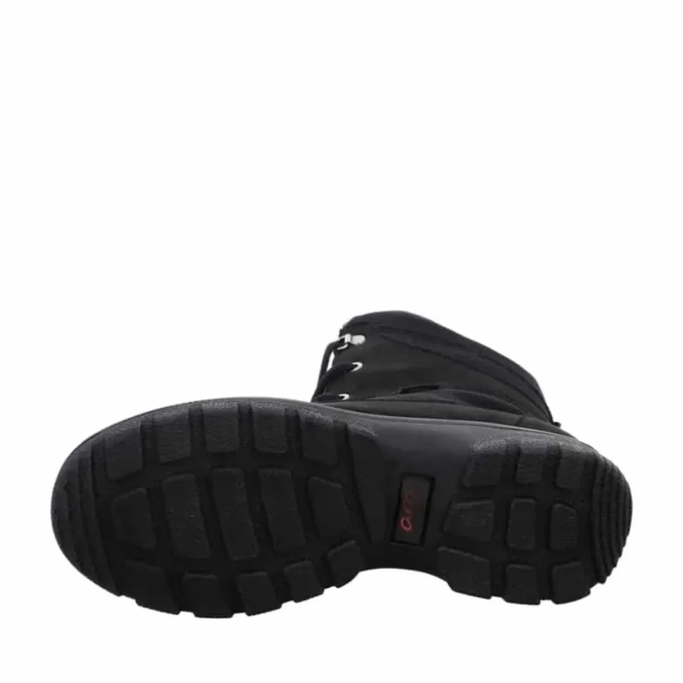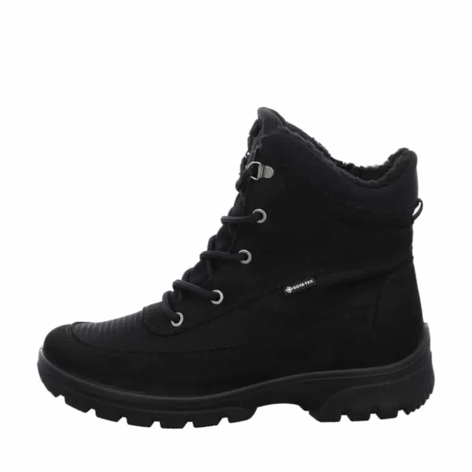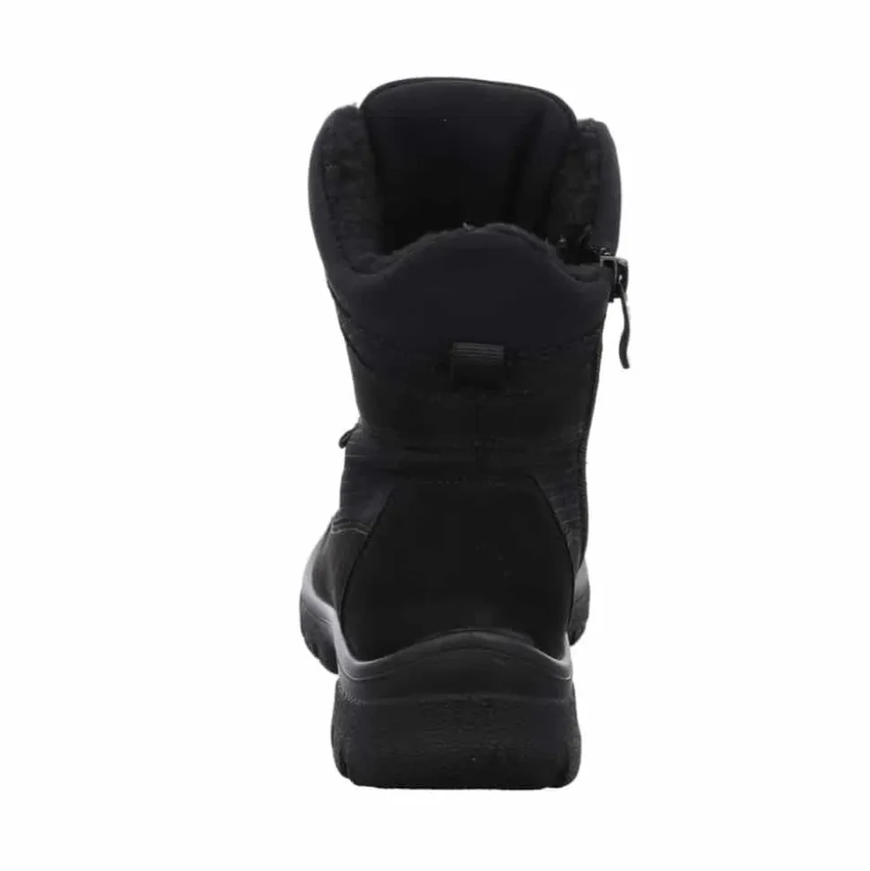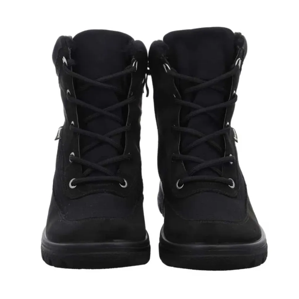 Ara vinterstøvle til dame i sort. Dårligt vejr er ingen hindring med denne støvle fra Ara. Udstyret med en vandtæt og åndbar GoreTEX membran holder den dine fødder tørre, mens det bløde varme foer sikrer, at de forbliver behageligt varme. Støvlen er lavet af robust, vedligeholdelsesvenligt syntetisk materiale, hvilket gør den let at bære. Den praktiske lynlås gør det nemt at tage støvlen på, og snørebåndene med store metaløjer giver en stilfuld detalje og mulighed for optimal tilpasning. Blød polstring omkring skaftet forhindrer ubehagelige trykpunkter, og den innovative HighSoft teknologi giver en blød, dæmpet gang. Fodsengen er blødt polstret og beklædt med frotté af bambus, der holder fødderne varme og absorberer fugt effektivt. Fodbedet kan nemt udskiftes med egne indlæg, og den skridsikre sål sikrer et godt greb.