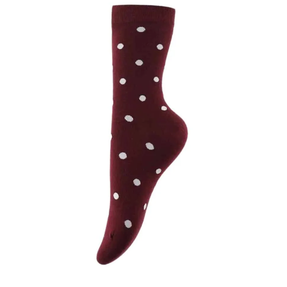 By Stær strømper til dame i bordeaux. Disse flotte strømper med hvide prikker er perfekt til at pifte sneakers og sandaler op. Det unikke design kombinerer elegance og komfort, mens de flotte prikker giver et ekstra stilfuldt udtryk. Med 80% bomuld er de bløde og åndbare, og 20% polyester sikrer god slidstyrke. Strømpen tåler maskinvask ved 30°C og er et ideelt valg til både hverdagsbrug og festlige lejligheder.