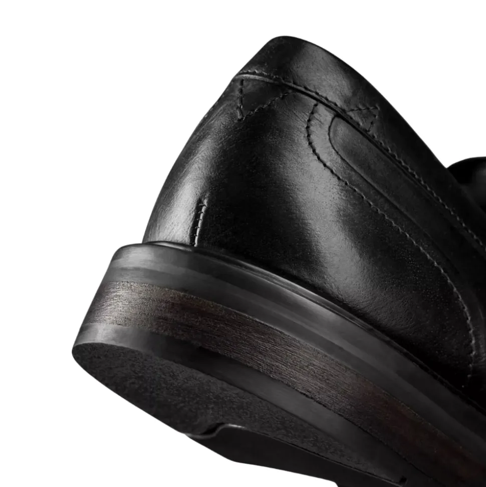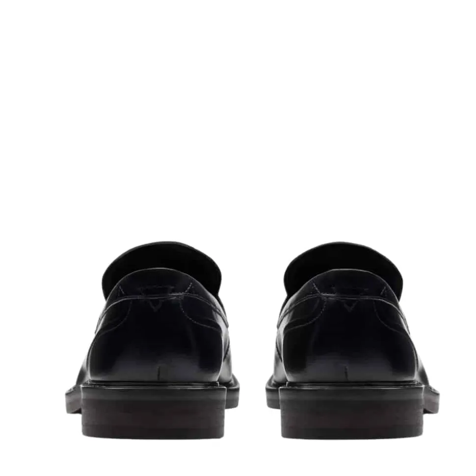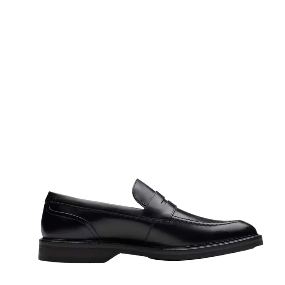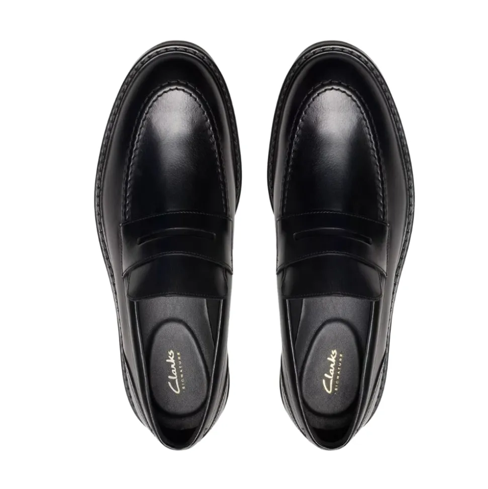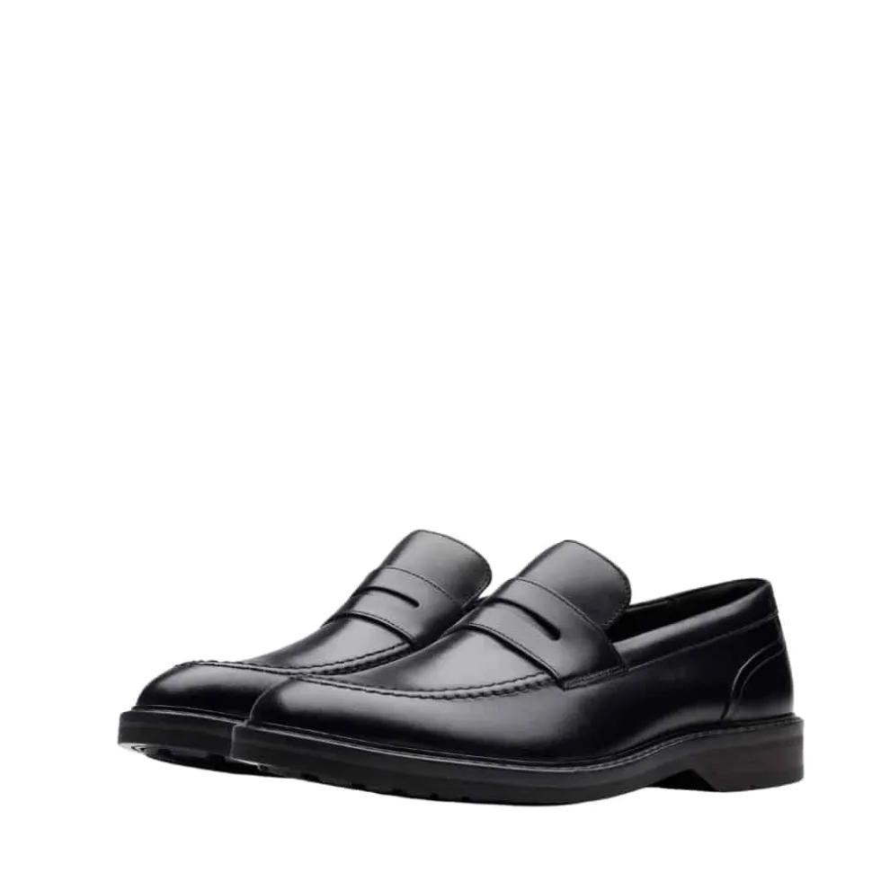 Clarks Aldwin Step loafers til herre i sort. Moderne loafers til herre i sort læder med markerede syninger der giver et stilfuldt look. Skoen er let at komme i og af samt udstyret med en blød indersål der er lavet af skind for optimal komfort. Skoen har en solid ydersål med et godt mønster for øget støtte og skridsikkerhed.
