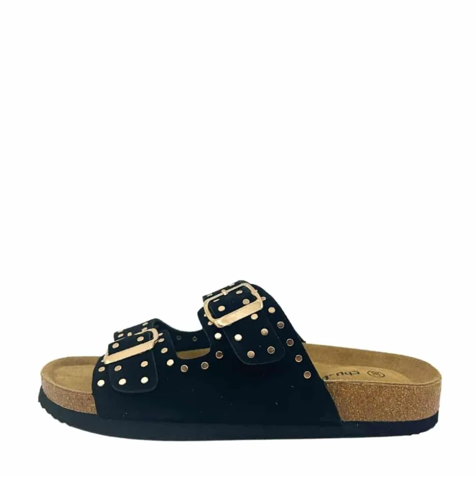 CPH-Comfort Bio sandal til dame i sort. Med sin elegante sorte farve og de dekorative nitter langs kanterne får denne sandal et stilfuldt og moderne udtryk. De to spænder giver mulighed for at justere pasformen, så den sidder behageligt gennem hele dagen. Den bløde indersål i ruskind sikrer optimal komfort, mens den rillet ydersål giver ekstra støtte og stabilitet.