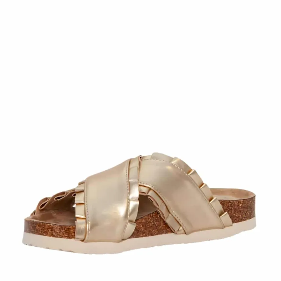 Duffy Florens Uno sandal til dame i guld. Denne fortryllende sandal i en moderne gylden farvetone er en sand fryd for øjet. Med sine smukt krydsende remme og plisserede kanter tilføjer den et unikt touch af elegance til ethvert outfit. Sandalen har også en dejlig blød sål, komplet med en ekstra pude i hælen, der sikrer optimal komfort hele dagen. Denne sandal er simpelthen uundværlig til sommeren, hvor dens fortryllende farve skaber et strålende look, mens dens solide sål giver stabilitet og støtte.