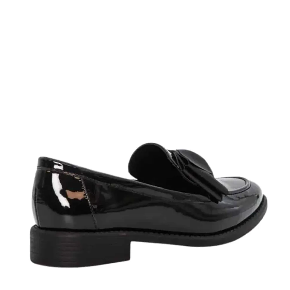 Duffy Francica Sette loafers til dame i sort lak. Disse loafers til dame kombinerer sort lakoverdel med en elegant sløjfe detalje for et feminint udtryk. Skoen er praktisk i hverdagen og let at komme i og af, samtidig med at den kan bruges til pænere lejligheder. Indvendigt finder du en blød indersål, der giver god komfort dagen lang. Den lille hæl på ca. 3 cm giver et diskret løft og bidrager til stabil støtte.