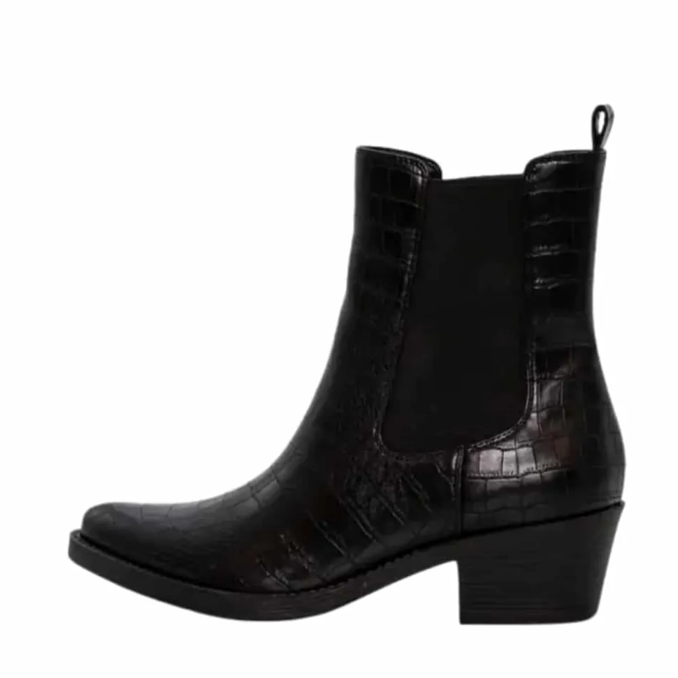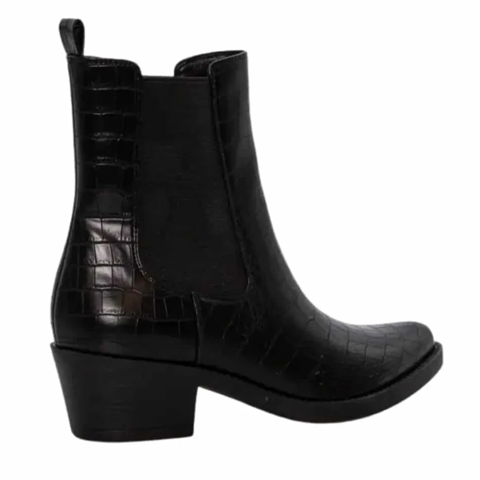 Duffy Messina Nove støvle til dame i sort. Flot og elegant chelseastøvle til dame i sort med en spids snude, der giver et moderne og feminint udtryk. Støvlen har elastik i begge sider, som gør støvlen nem at tage af og på, samtidig med at den tilpasser sig foden. Indvendigt finder du en blød sål, der giver behagelig komfort hele dagen. Den 5 cm høje blokhæl fuldender designet med et flot og elegant løft.
