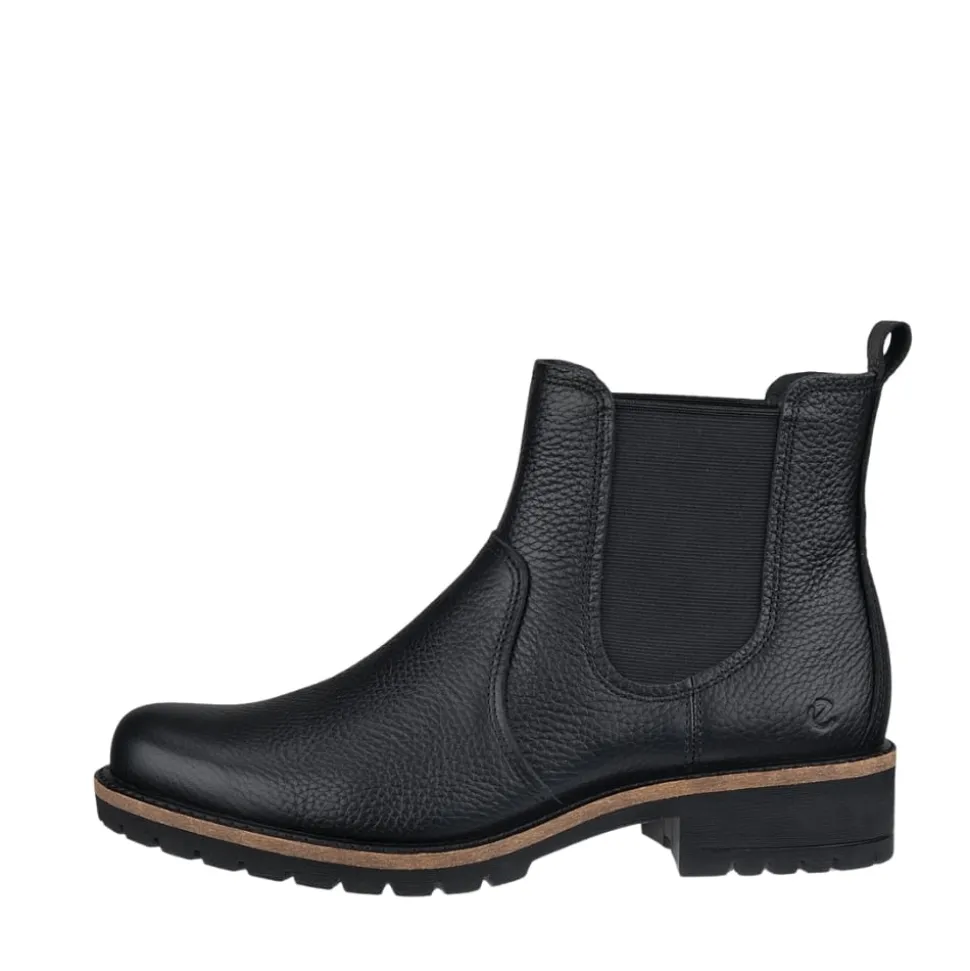 Ecco Elaina støvle til dame i sort. Elegant sort chelseastøvle i læder, der kombinerer tidløst design med moderne komfort. Støvlen har elastikker i siderne, som gør den nem at tage på og giver en fleksibel pasform. Indvendigt er den udstyret med en blød, udtagelig indersål for behagelig støtte, mens Ecco Fluidform™ teknologien giver naturlig bevægelse og blød komfort. Den solide ydersål med blokhæl på ca. 4 cm og mønster sikrer stabilitet og skridsikkerhed hele dagen.
