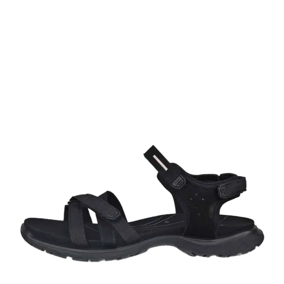 Ecco Offroad Roam sandal til dame i sort. Denne sandal kombinerer elegant design med maksimal komfort. Den har en blød læderoverdel og tre justerbare velcroremme, der sikrer en fleksibel pasform og gør den nem at tage af og på. Det tidløse design fuldendes af en stilfuld krydsrem foran. Indersålen er udstyret med Ecco Fluidform™ teknologi, der giver fremragende stødabsorbering og fleksibilitet. Den slidstærke gummisål med Ecco Receptor® teknologi sikrer stabilitet og støtte på alle underlag.
