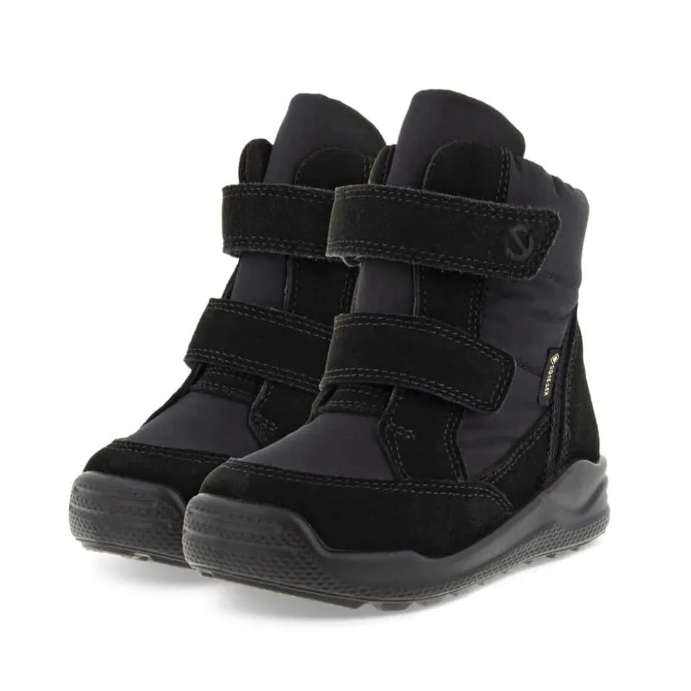 ECCO Urban Mini støvle til børn i sort. Oplev den perfekte vinterstøvle til leg i sneen og det kolde eller våde vejr! Denne lette og fleksible støvle kombinerer smukke skinddetaljer med maksimal funktionalitet. Med 100% vandtæt GoreTEX-membran holdes fødderne tørre uanset vejret, mens det varme, dyrevenlige “FAUX FUR”-for sørger for, at dit barn har det lunt og godt hele vinteren. To praktiske velcrolukninger gør det supernemt for børn selv at tage støvlerne af og på – hurtigt og uden besvær. Ideel til sjove vinterdage, hvor komfort, varme og stil går hånd i hånd!