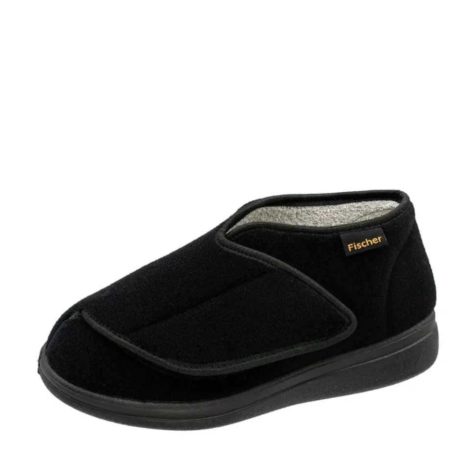 Fisher hjemmesko til dame og herre i sort. Fremstillet i blødt velour med en bred velcrorem der foldes hele vejen henover vristen, så denne hjemmesko forblive fast på foden, mens det bløde frottéfoder sikrer, at dine fødder forbliver varme og komfortable hele dagen. Den lette PU-sål giver et godt greb og stabilitet, hvilket gør dem ideelle til både indendørs og udendørs brug. Med en hælhøjde på 30 mm og en bredde i L, tilbyder disse hjemmesko ekstra plads og komfort. Desuden har de en udtagelig indlægssål, så du kan tilpasse dem efter dine behov. Disse hjemmesko det perfekte valg for alle, der ønsker at forkæle deres fødder med stil og funktionalitet og som kan have svært ved at holde skoen på fødderne. Gør dig klar til at nyde afslapning med disse stilige og komfortable hjemmesko!