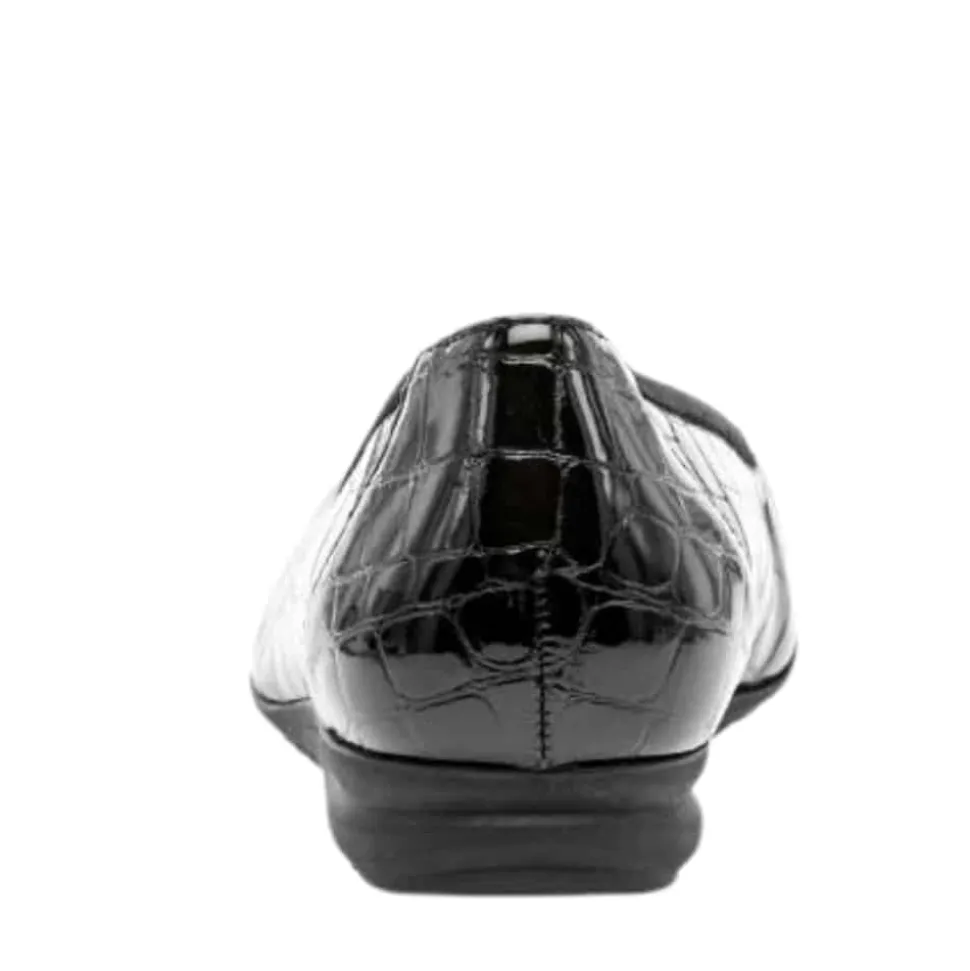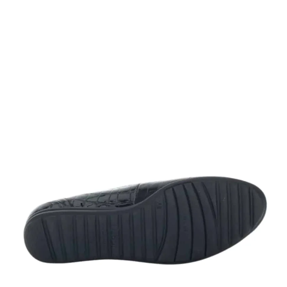 Gabor ballerinasko til dame i sort. Elegant ballerina i klassisk sort med en stilfuld lakoverflade og krokodillemønster, der tilføjer et moderne touch. Indvendigt sørger en blød skindsål for høj komfort, mens den ekstra bredde (G) sikrer en rummelig og behagelig pasform. Skoen har en lille kilehæl på 2,5 cm, der giver et let løft, og den skridsikre ydersål bidrager til stabilitet hele dagen