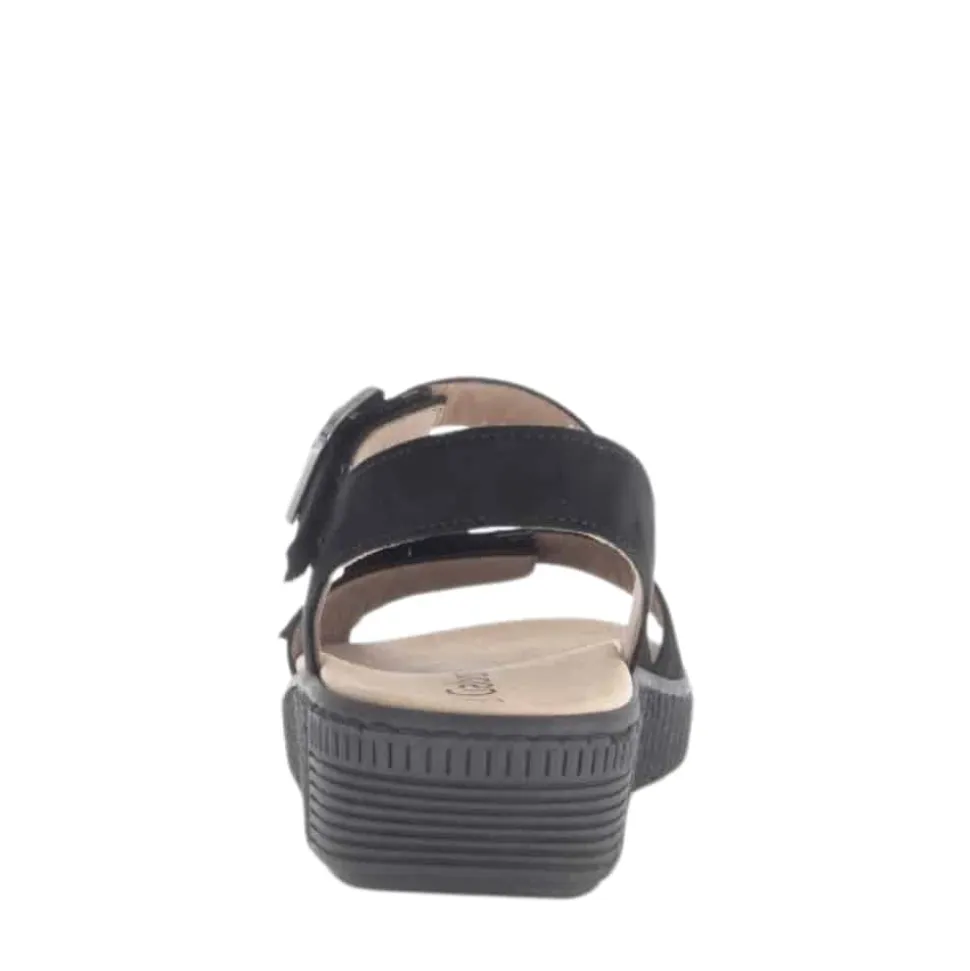 Gabor sandal til dame i sort. Klassisk sort damesandal med fine spændedetaljer, der giver et moderne og elegant udtryk. Overdelen i blødt skind og de to justerbare velcroremme sikrer en fleksibel pasform. Indvendigt har sandalen en blød og udtagelig sål, som kan maskinvaskes ved 30 grader for ekstra bekvemmelighed. Med en 4 cm kilehæl opnår du et elegant løft uden at gå på kompromis med komforten, mens den skridsikre gummisål giver stabilitet og sikkerhed i hvert skridt
