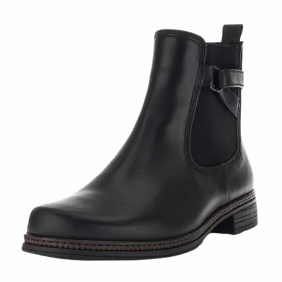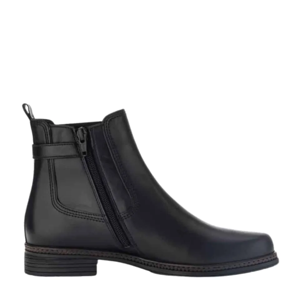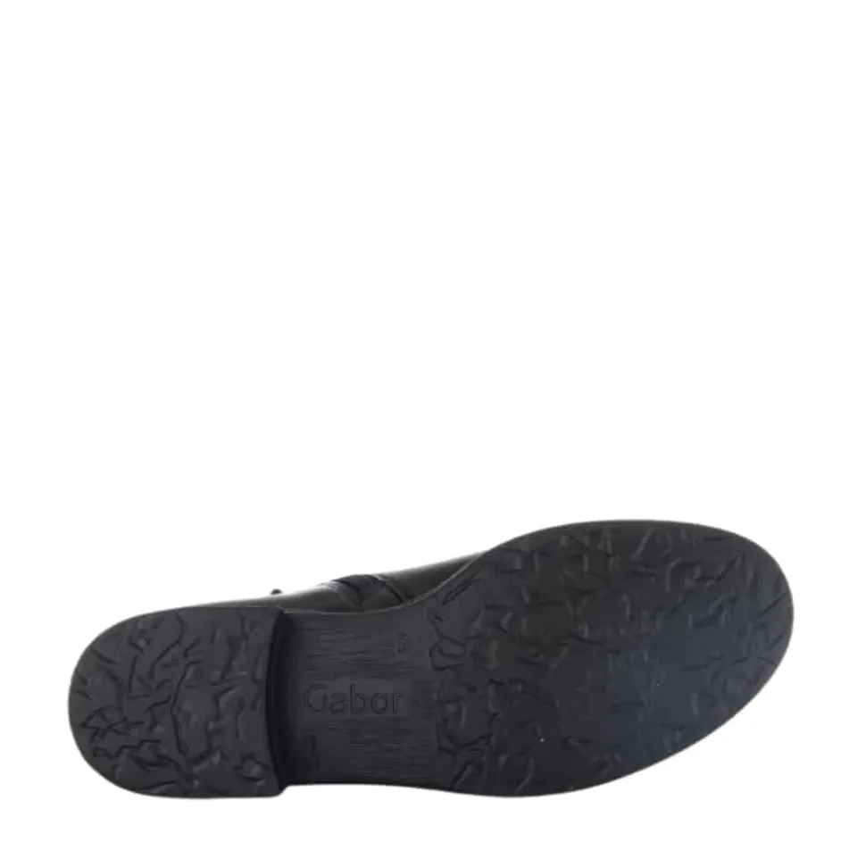 Gabor støvle til dame i sort. Dejlig let støvle i lækker skindkvalitet. Støvlen har en lækker overdel af glatskind samt fine detaljer på siden. Støvlen er dejlig nem at komme i og af med lynlås på indersiden samt elastik på ydersiden. Desuden har støvlen en dejlig pasform for optimal komfort. Støvlen har en også skridsikker ydersål med et godt mønster, der hjælper dig med at stå bedre fast.