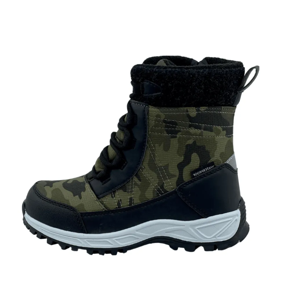 Kompis støvle i camoflage farve til børn. Super lækker varmforet støvle fra Kompis, i en smart camoflage farve med fine detaljer. Modellen har funktionel lynlås på indersiden, samt justerbar snøre foran som gør det nemt for børnene, selv at kunne få den af og på. Endnu en fordel ved denne støvle er at den er vandtæt og har udtagelige såler.