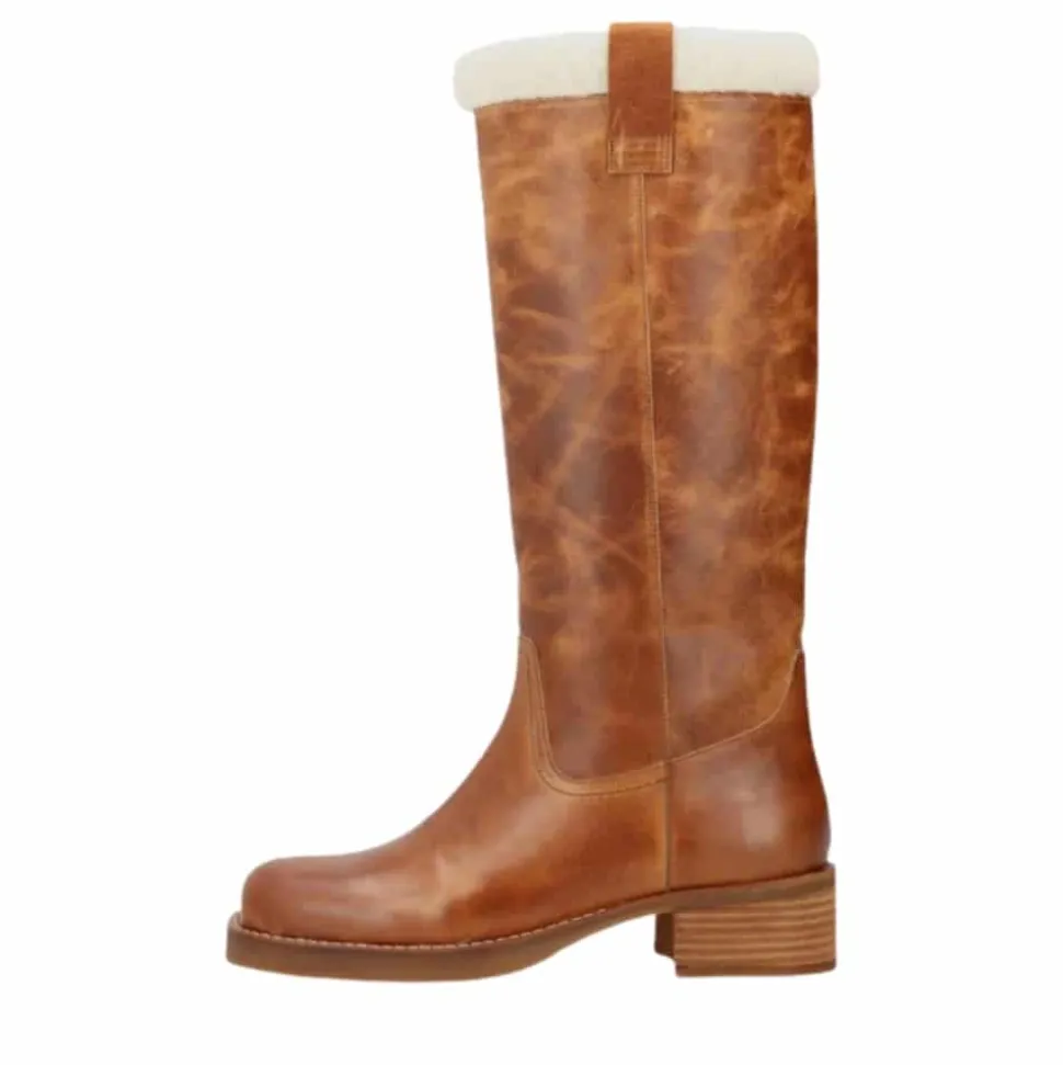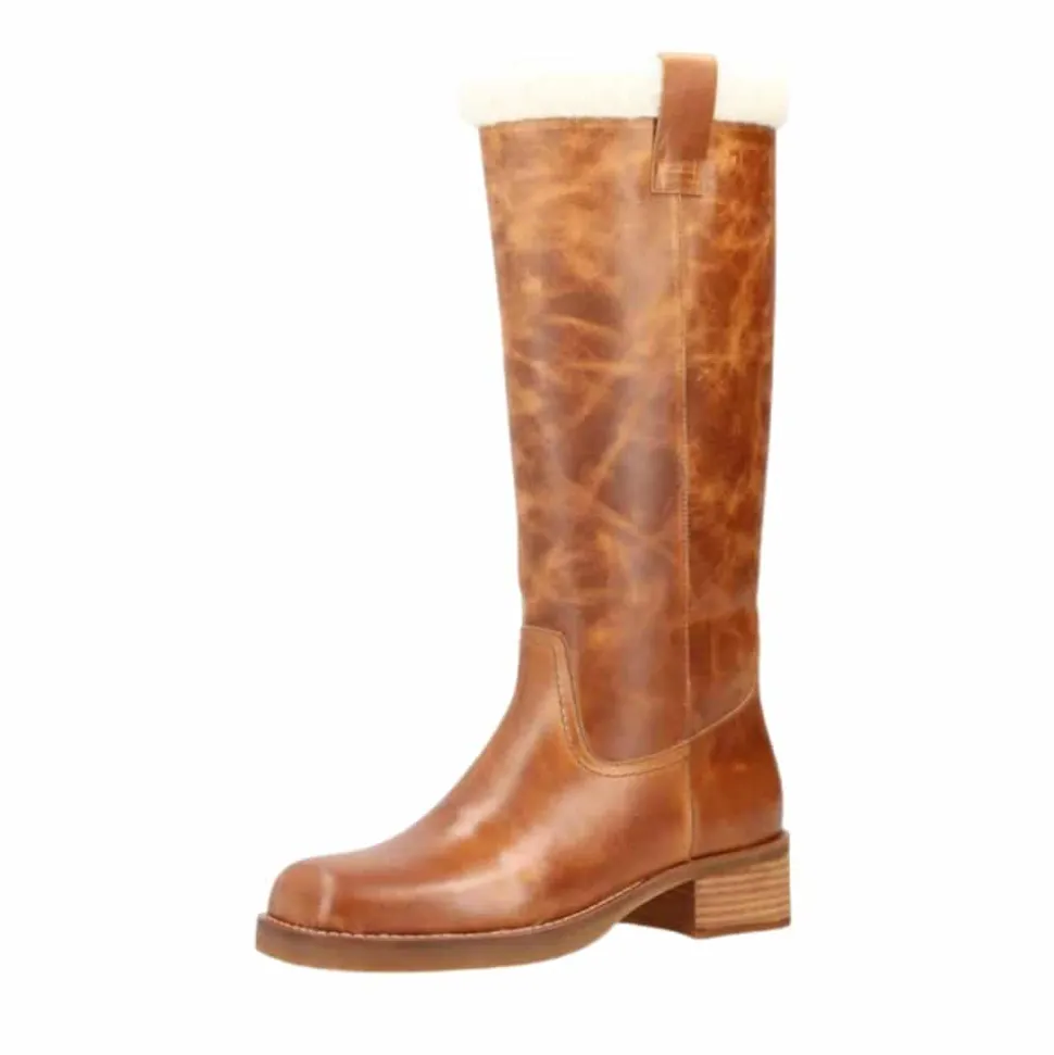 Phenumb Copenhagen Cameron Warm lang støvle til dame i cognac. Denne flotte og elegante støvle er perfekt til dig, der ønsker et tidløst design. Overdelen er lavet af læder, som gør at støvlen bliver smukkere med tiden. Indvendigt finder du en varm foring, der giver komfort på kolde dage. Den firkantede snude tilfører et moderne touch, mens blokhælen på 5 cm giver et elegant løft. Støvlen kan nemt kombineres med enhver garderobe.