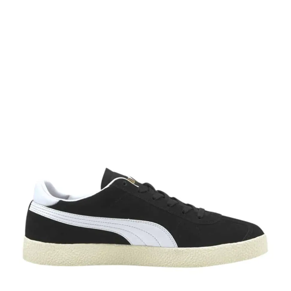 Puma Club sneakers i sort. Opnå en perfekt stil med PUMA Club Trainers, der er inspireret af fodboldens æstetik. Disse sneakers kombinerer en overdel af ruskind med klassiske PUMA-elementer, og SoftFoam+ indersålen sikrer øjeblikkelig og langvarig komfort med blød polstring ved hvert skridt. Den karakteristiske gummisål tilføjer et sofistikeret look med en sporty kant, perfekt til enhver sneaker-entusiast, der ønsker en elegant opdatering til garderoben. Skoen har en snørelukning og en ruskindstunge, mens PUMA Archive No. 1 logoet pryder tungen, og PUMA No. 2 logoet samt PUMA Formstrip ses på siden. Indersålen er 100% tekstil, ydersålen er 100% gummi, og overdelen består af kohud og syntetisk materiale, med en indvendig foring af 100% syntetisk materiale.