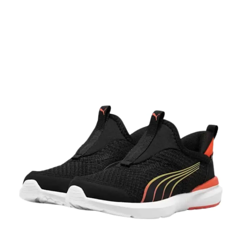 Puma Kruz Profoam Sliptech Sneakers til børn i sort. Små eventyrere kan udforske verden med blød komfort i PUMA Kruz ProFoam. Med nem slip-on funktion, åndbart mesh og støddæmpende komfort, er der eventyr i vente ved hvert skridt.