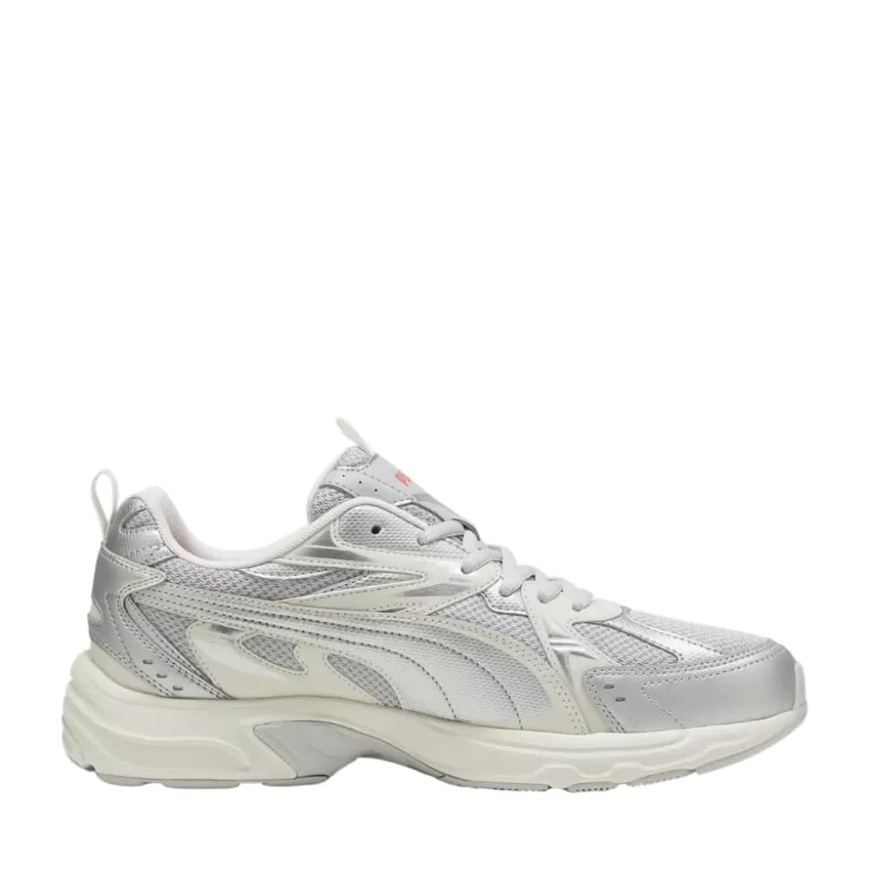 Puma Milenio Tech sneakers i sølv/metal til dame. Milenio Tech er inspireret af de populære løbesko fra årtusindeskiftet og bringer 00’ernes stil tilbage med et moderne twist. Kombinationen af frisk mesh og skinnende metalliske toner giver skoen et både stilfuldt og behageligt udseende. Skoens SOFTFOAM+ indersål sikrer ekstra blød polstring og komfort ved hvert skridt takket være en ekstra tyk hæl. Overdelen er lavet af luftigt air mesh, mens mellemsålen er fremstillet af let IMEVA, og ydersålen består af slidstærkt gummi. Det ikoniske PUMA Formstrip pryder siderne, og PUMA No.1 logoet på tungen samt PUMA Cat logoet på hælen fuldender looket. Indersålen er 100% tekstil, ydersålen er 100% gummi, og overdelen består af syntetisk materiale og tekstil, hvilket giver en perfekt balance mellem holdbarhed og åndbarhed.