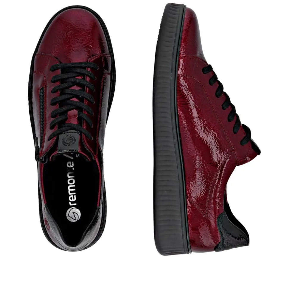 Remonte sneakers til dame i rød. Moderne sneakers til dame i en flot rød farve med fine detaljer. Skoen har både snørebånd og en funktionel lynlås, som gør den nem at tage på og tilpasse til foden. Indvendigt finder du en blød udtagelig Remonte-Soft indersål, der giver komfort hele dagen. Modellen har ekstra bredde (G), hvilket sikrer mere plads og en fleksibel pasform. Den lette og fleksible ydersål har et godt mønster, som øger både stødabsorbering og skridsikkerhed.