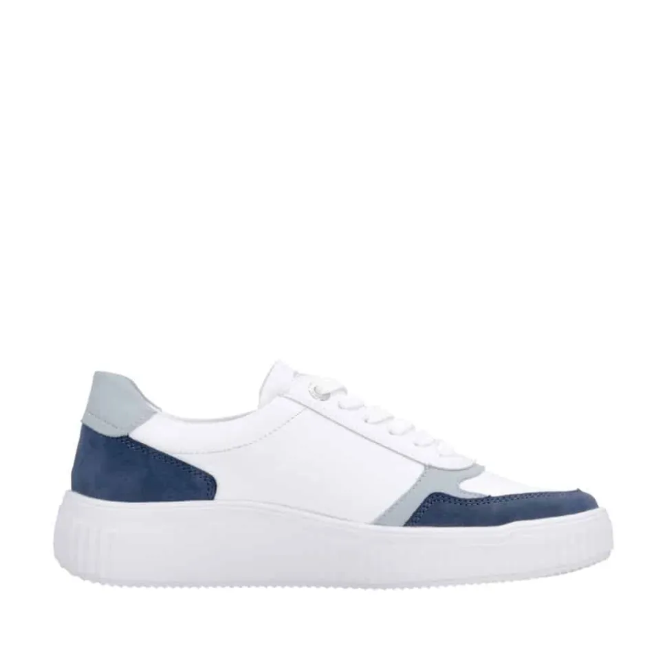 Remonte sneakers til dame i hvid. Disse smarte sneakers med skindoverdel i hvid og blå detaljer kombinerer stil med praktiske løsninger til hverdagen. Skoen er udstyret med både snørebånd og en funktionel lynlås, så pasformen nemt kan justeres efter foden. Indvendigt bliver du mødt af en blød og udtagelig indersål samt ekstra bredde (H), som giver god rummelighed og høj komfort hele dagen. Ydersålen er designet med et mønster, der giver øget stødabsorbering og skridsikkerhed i hvert skridt.