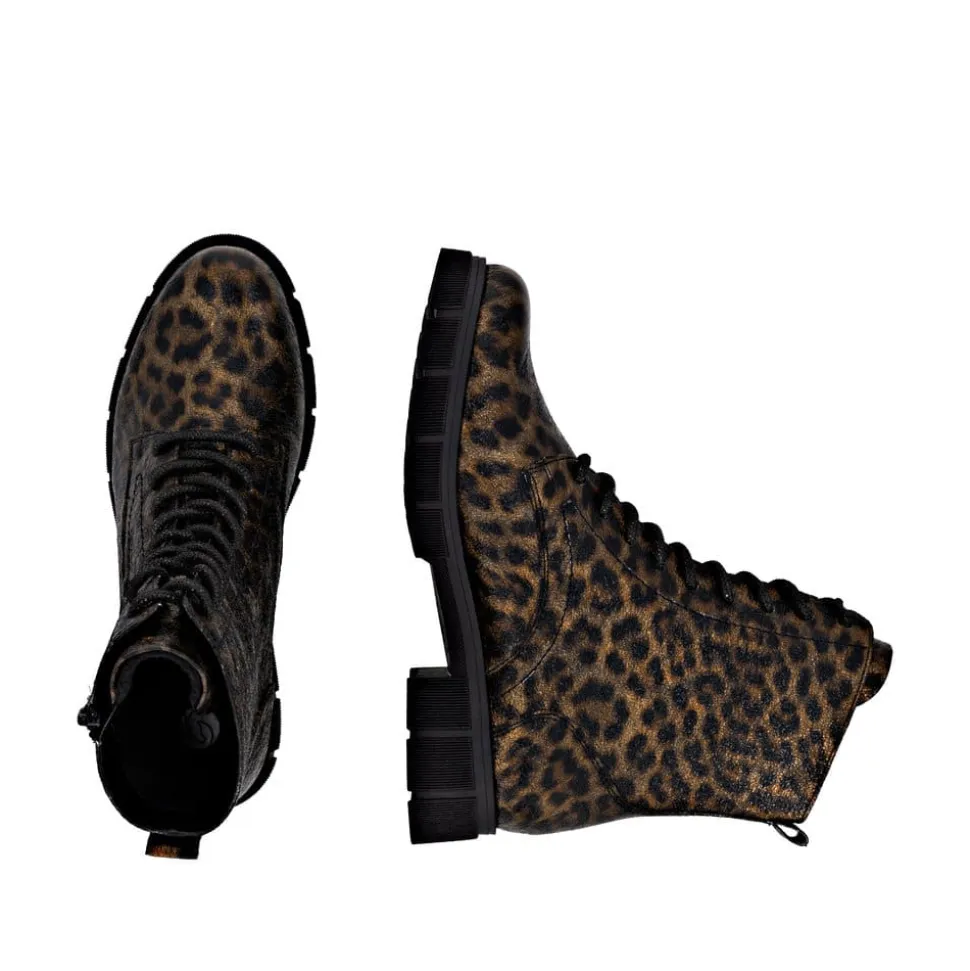 Remonte støvle til dame i leopard. Stilfuld støvle med tekstureret overdel i leopardmønster, der giver et moderne udtryk. Støvlen har snørebånd, som kan udskiftes, samt en praktisk lynlås på ydersiden, der gør den nem at tage af og på. Indvendigt finder du en blød indersål og en let foring samt ekstra bredde G giver god rummelighed. Den chunky ydersål på cirka 4 cm har et mønster, der sikrer øget skridsikkerhed og støtte.
