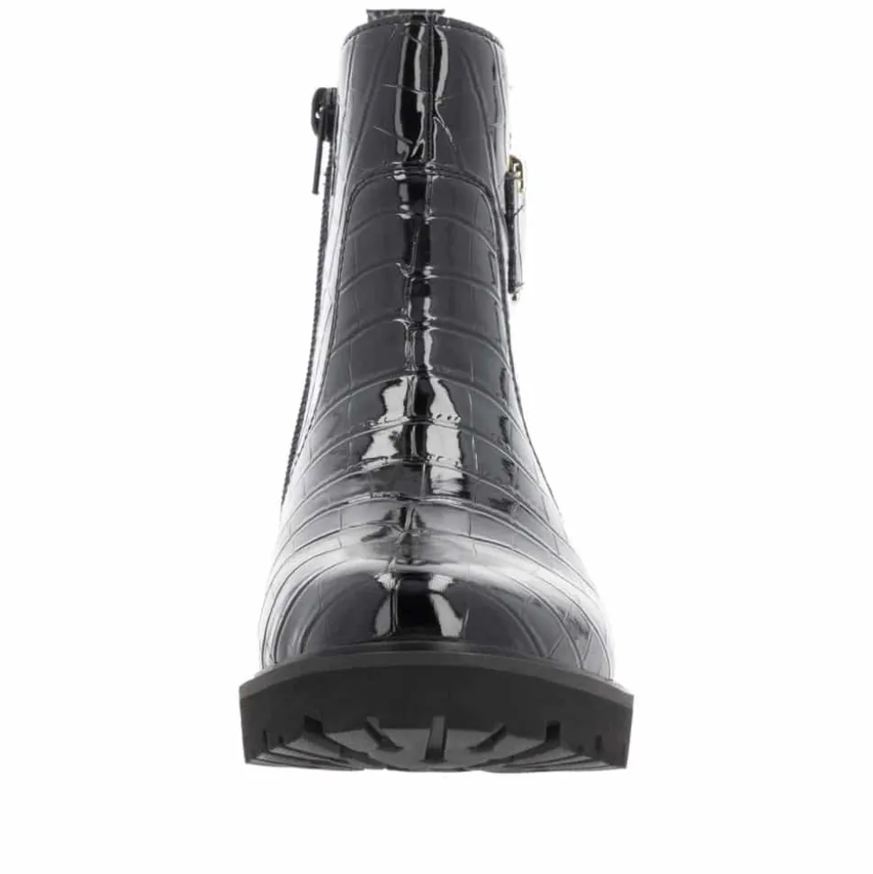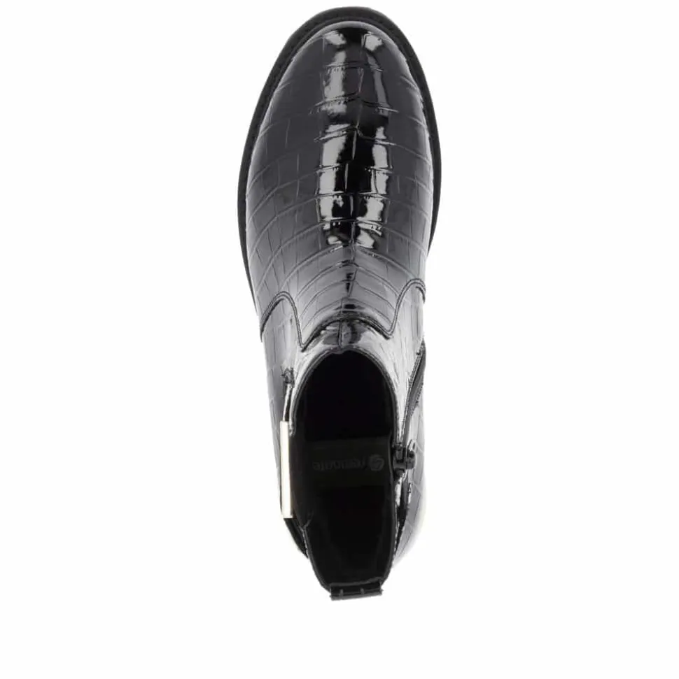 Remonte støvle til dame i sort. Denne super moderne støvle i en elegant sort farve med krokodillemønster og lak finish giver et ekstra sofistikeret touch. Støvlen er smukt dekoreret med gulddetaljer på siden og bag hælen. Indvendigt bliver du mødt af en let foring og en blød indersål, der kan tages ud efter behov. Med den praktiske lynlås på indersiden og elastikken på ydersiden er det nemt og hurtigt at tage støvlen af og på. Den robuste chunky sål med et godt mønster giver øget støtte og skridsikkerhed.