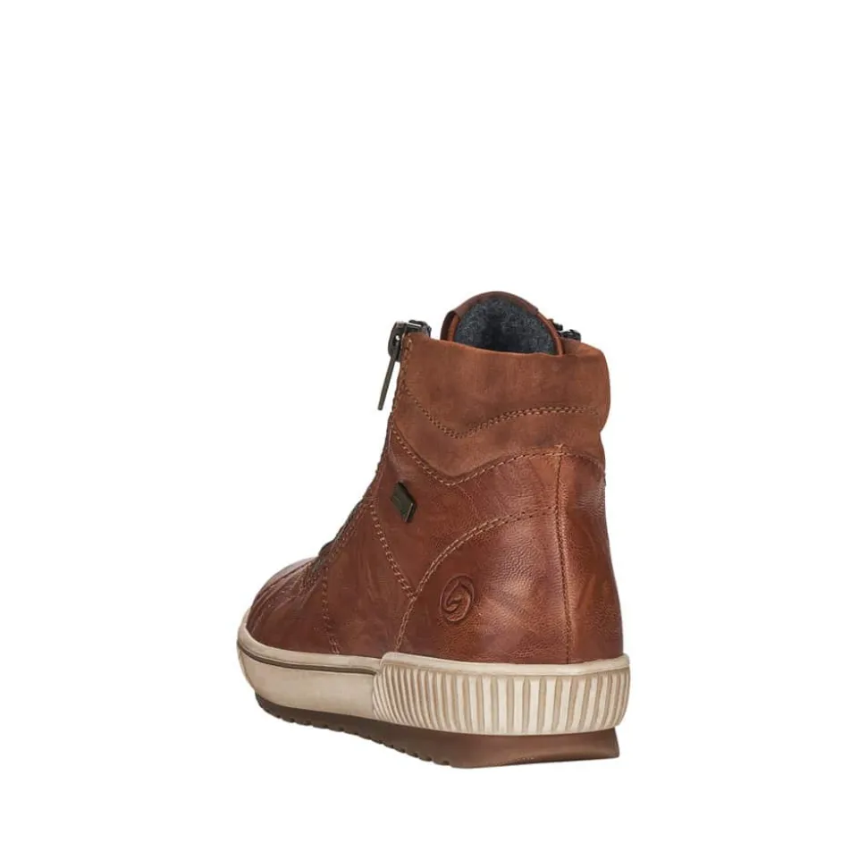 Remonte støvle til dame i brun. Elegant brun damestøvle med komfortvidde G, der kombinerer stil og komfort i hverdagen. Den bløde skindoverdel former sig efter foden, og de flotte detaljer tilfører et stilfuldt udtryk. Med to praktiske lynlåse er det nemt at tage støvlen af og på. Den lette foring holder fødderne varme på kølige dage, mens den udtagelige indersål giver god komfort. RemonteTex-teknologien gør støvlen kraftigt vandafvisende, og den stødabsorberende, skridsikre ydersål sikrer både komfort og stabilitet.