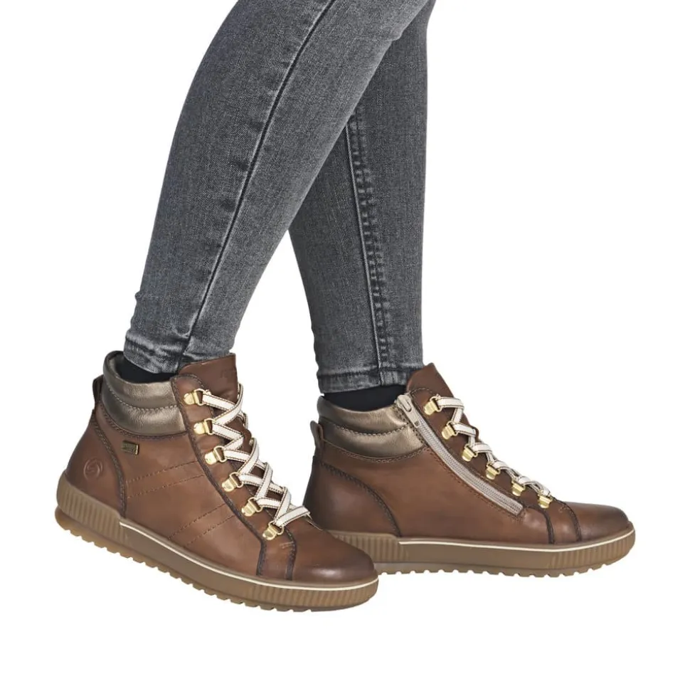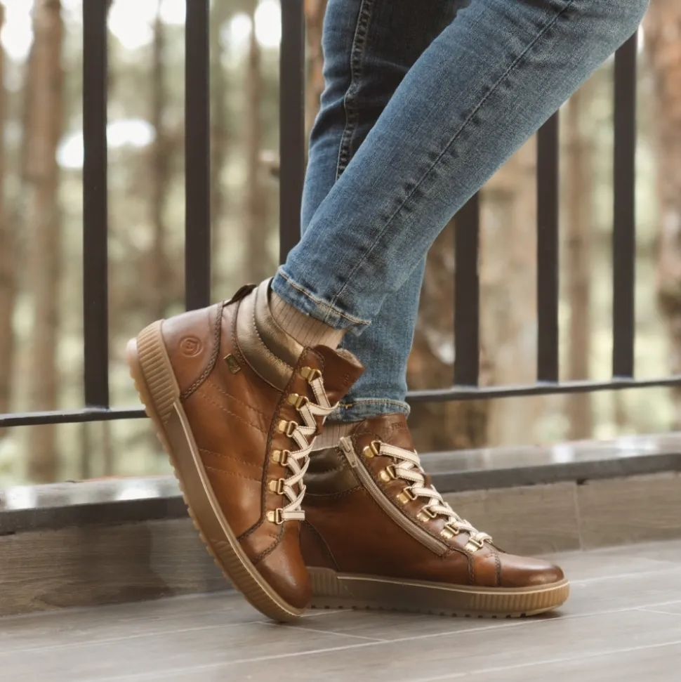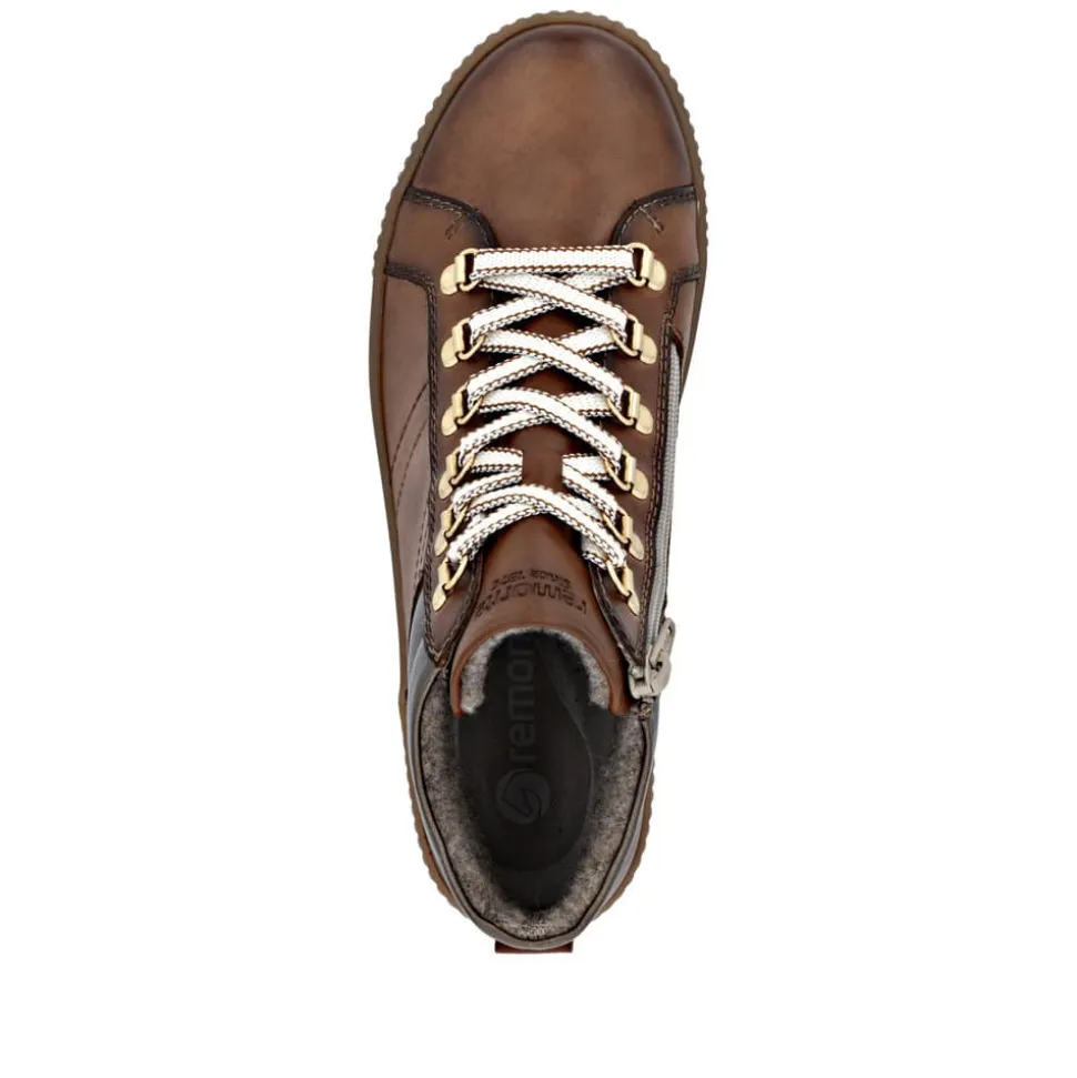Remonte støvle til dame i brun. Denne brune støvle kombinerer stil og komfort på bedste vis. Overdelen er i skind, og med justerbare snørebånd som kan skiftes samt en praktisk lynlås på indersiden er den nem at tage af og på. Indvendigt finder du en blød og udtagelig Remonte Soft sål, der giver komfort hele dagen. Støvlen har ekstra bredde G, som sikrer god rummelighed og Remonte-Tex der gør den kraftig vandafvisende. Den solide ydersål med mønster giver øget skridsikkerhed, mens de stødabsorberende egenskaber bidrager til en behagelig gangoplevelse.