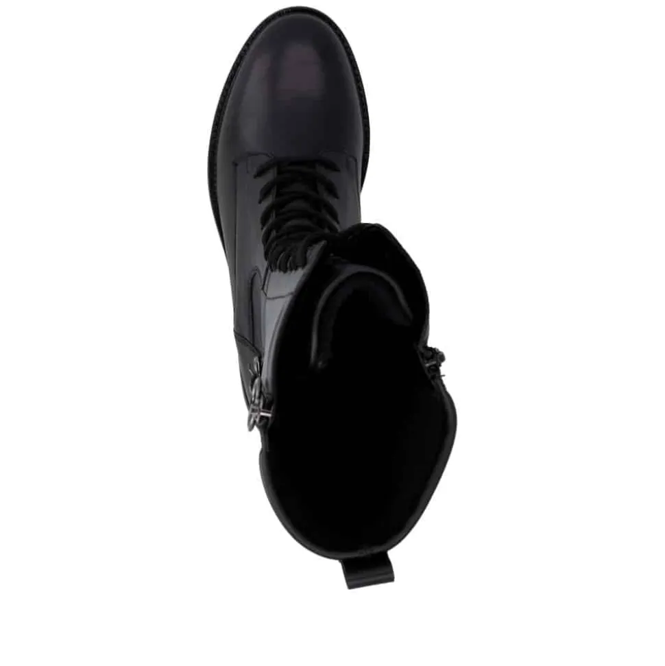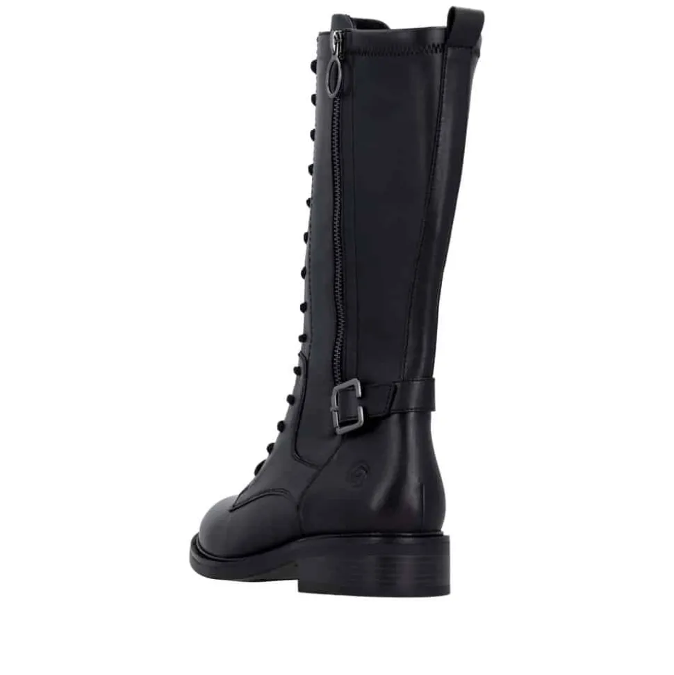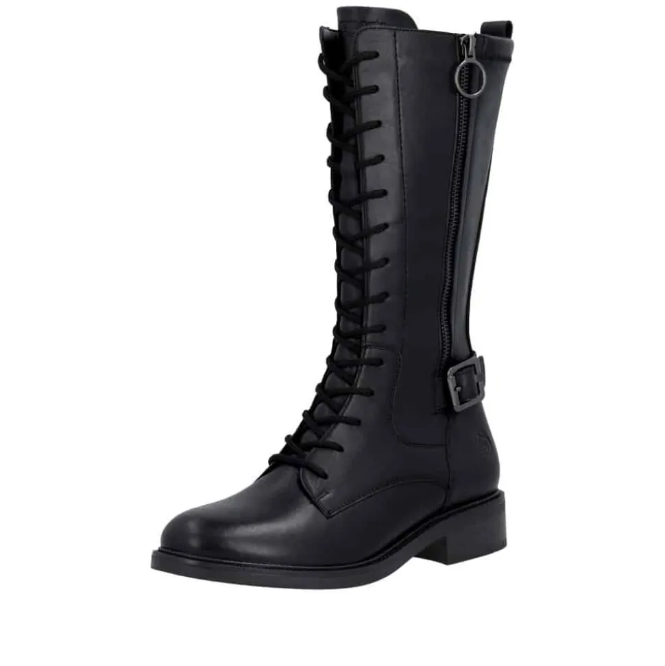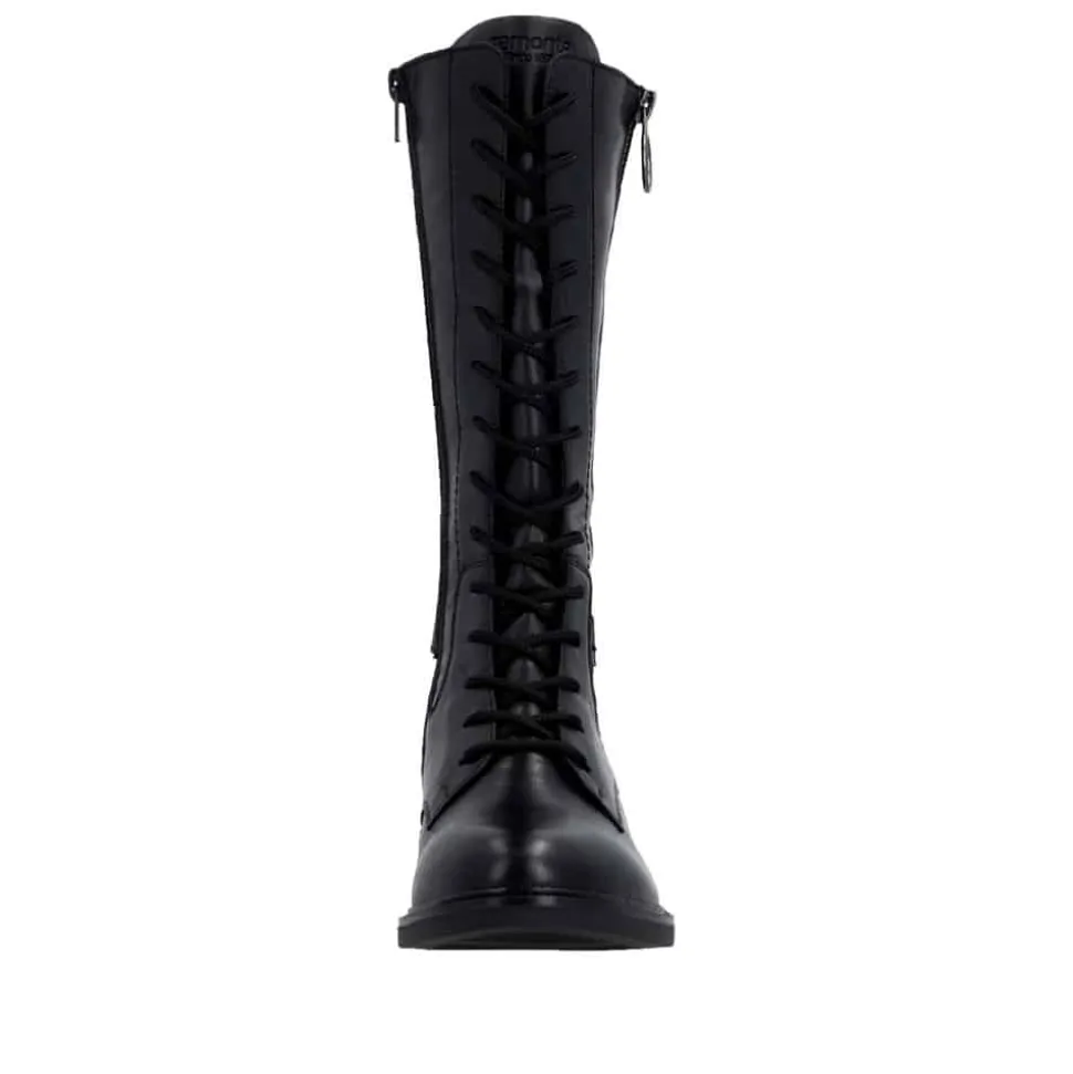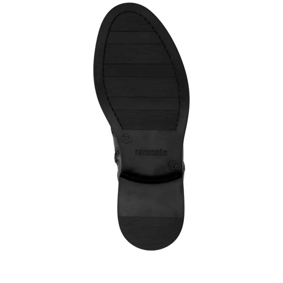 Remonte støvle til dame i sort. Moderne sort støvle med pynte lynlås og spænde på siden samt mellemlangt skaft, som giver et stilfuldt og feminint udtryk. Overdelen er fremstillet i skind, og støvlen er udstyret med snørebånd foran og en funktionel lynlås på indersiden, så den er nem at tage af og på. Indvendigt finder du en let foring og en blød, udtagelig Remonte-Soft sål, der sikrer høj komfort hele dagen. Den lille blokhæl på ca. 3,5 cm fuldender designet med et elegant løft, uden at det går ud over komforten.