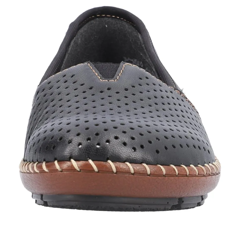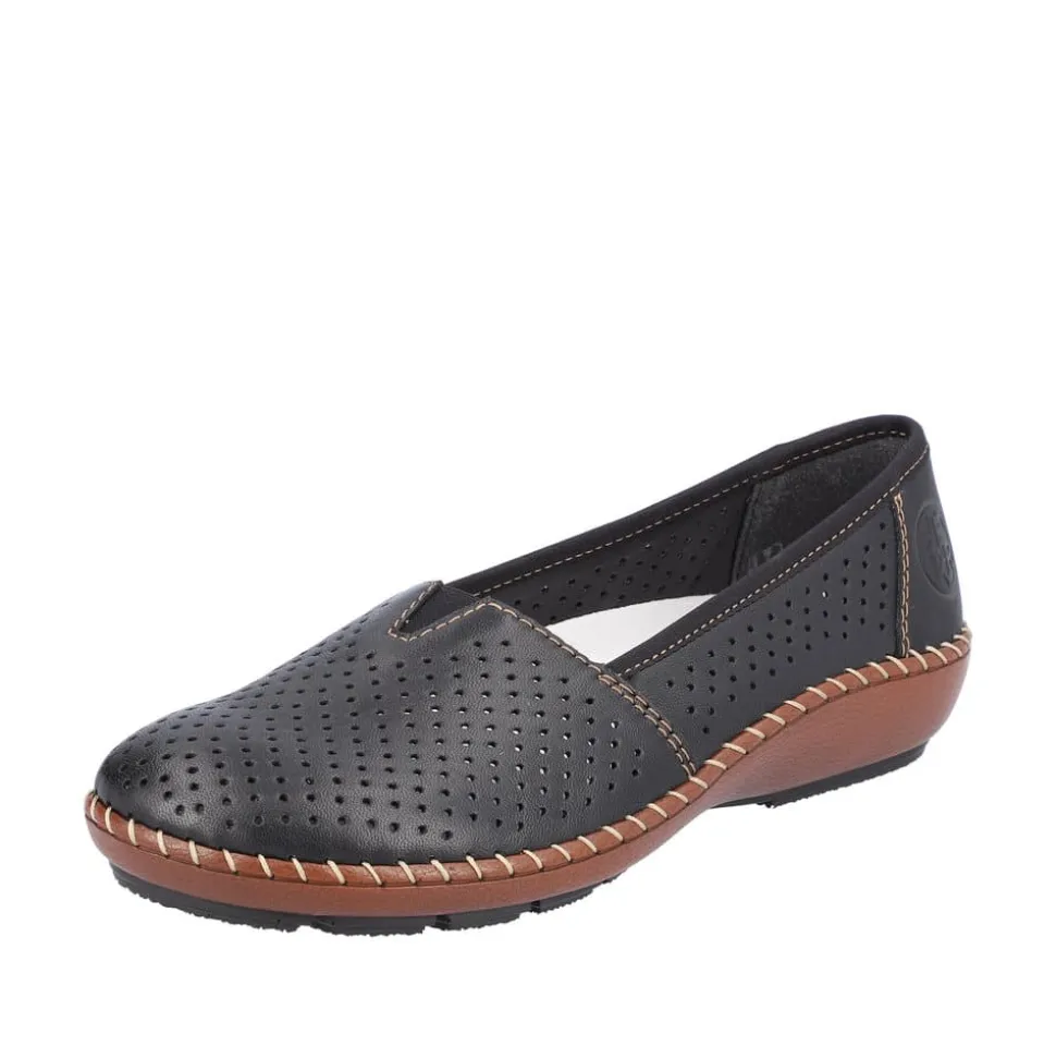 Rieker ballerinasko til dame i sort. Elegant ballerinasko i klassisk sort med fine perforeringer, der giver et stilfuldt look og øget åndbarhed. Den bløde skindoverdel sikrer en behagelig pasform, mens den diskrete elastik foran gør det nemt at tage skoen af og på. Indvendigt forkæler en blød skindindersål dine fødder med komfort hele dagen. Ydersålen har stødabsorberende egenskaber, der giver ekstra støtte.