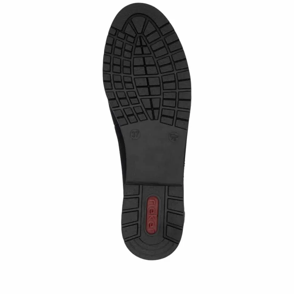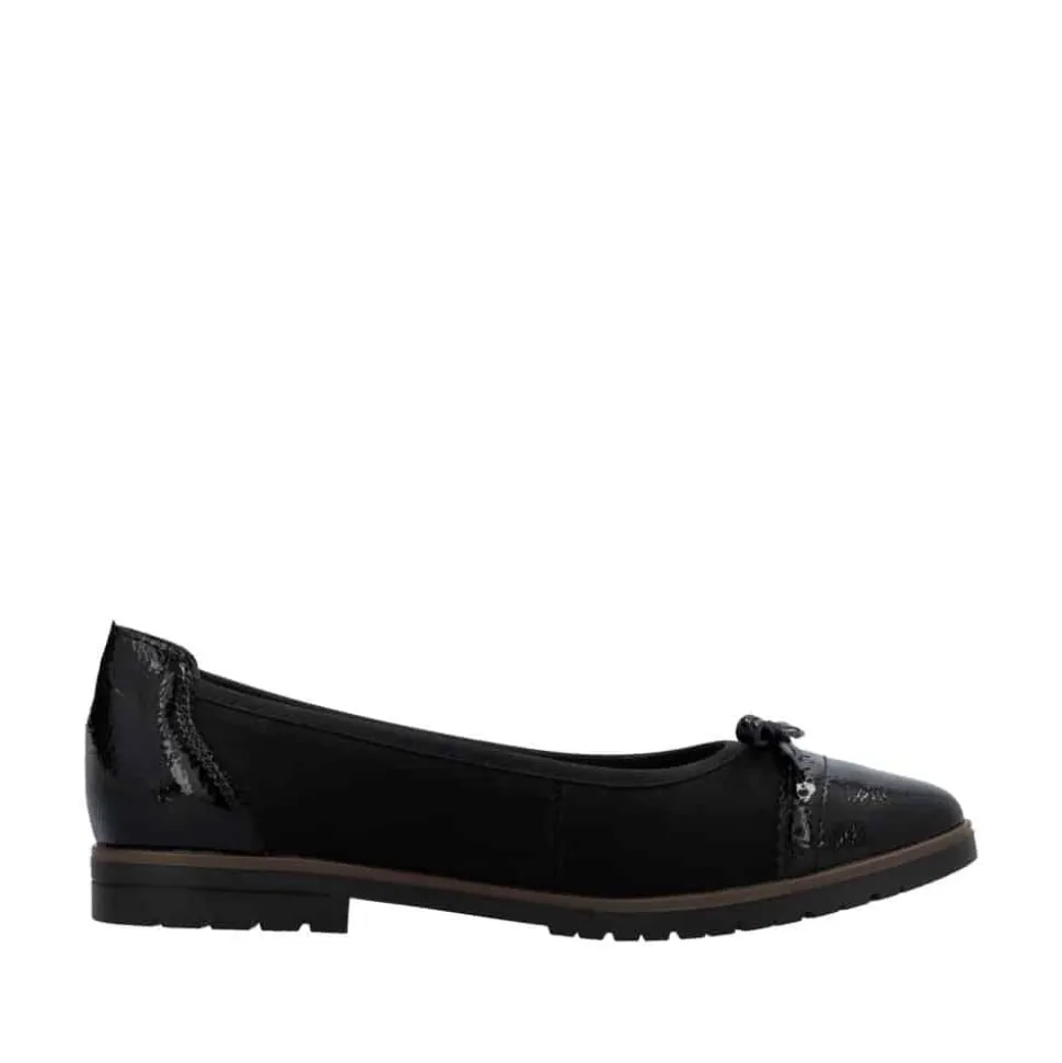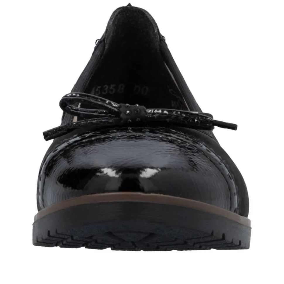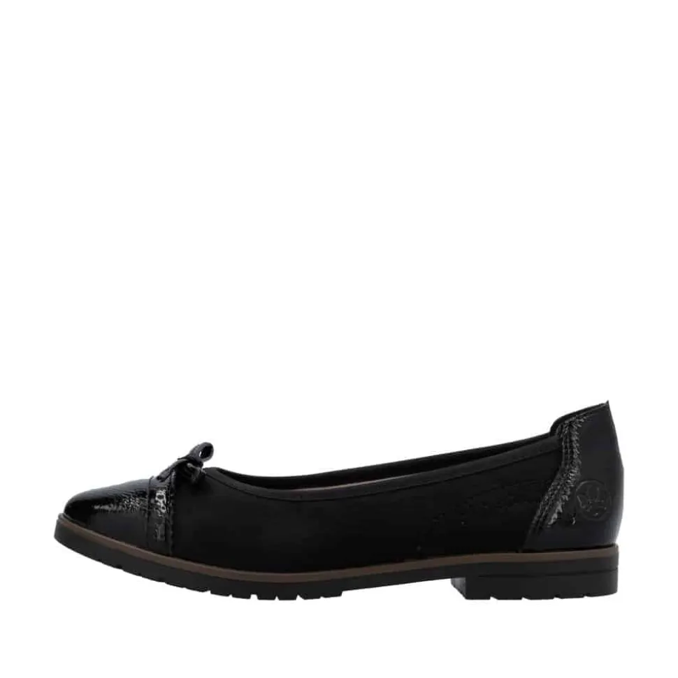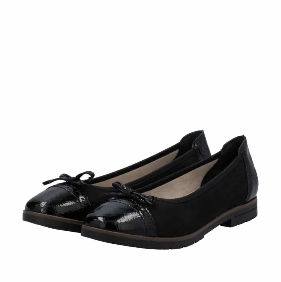 Rieker ballerinasko til dame i sort. Denne moderne ballerinasko i klassisk sort er et perfekt valg til dig, der søger stil og komfort. De flotte lakdetaljer og den elegante sløjfe foran giver skoen et feminint og sofistikeret look. Indvendigt er skoen udstyret med en blød skind indersål, der sikrer maksimal komfort. Den lidt grove sål tilføjer et råt twist til det elegante design og giver ekstra skridsikkerhed og støtte takket være dens stødabsorberende egenskaber.