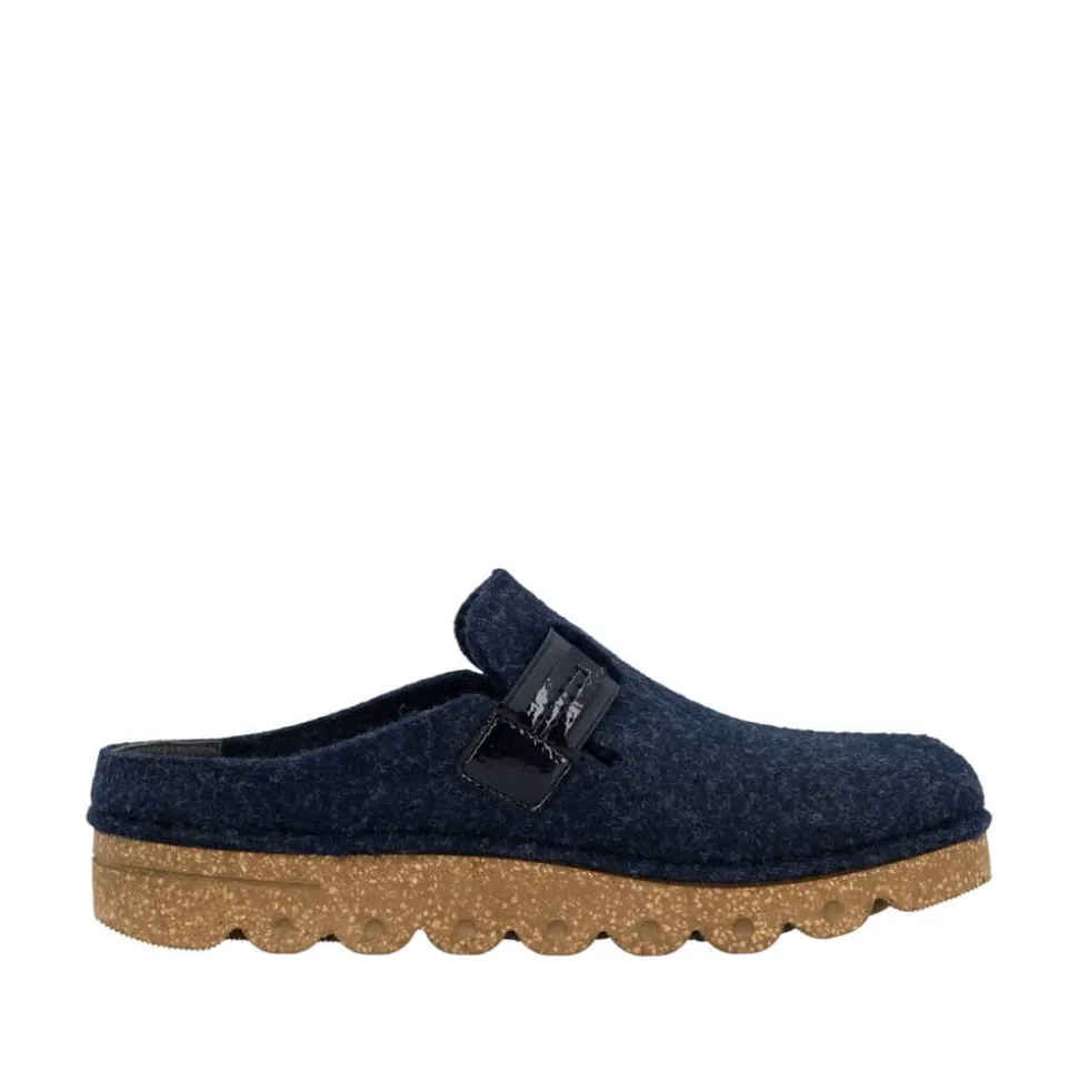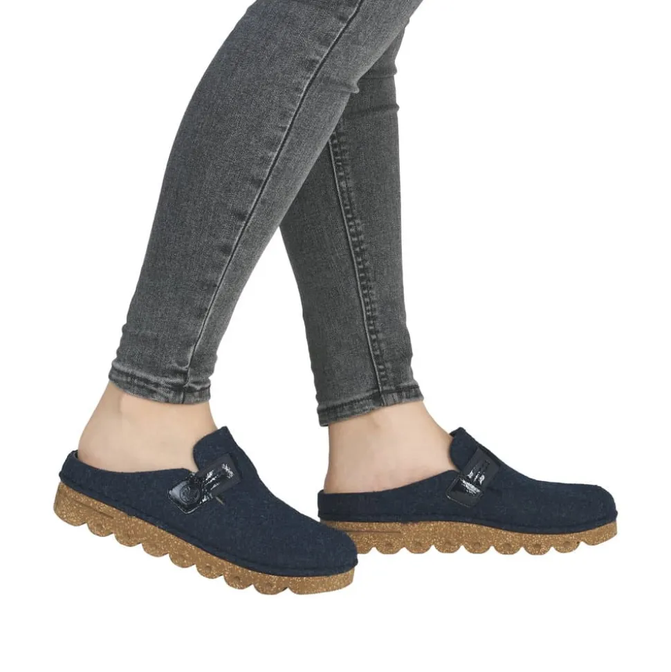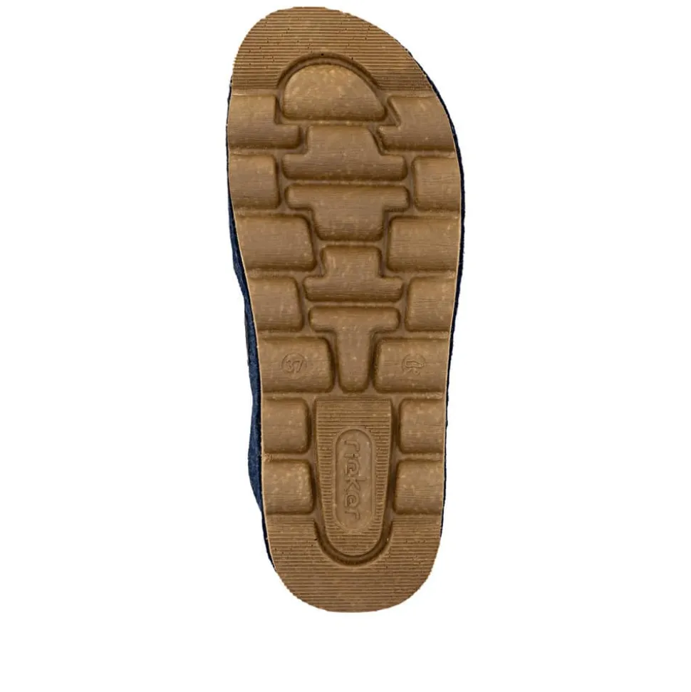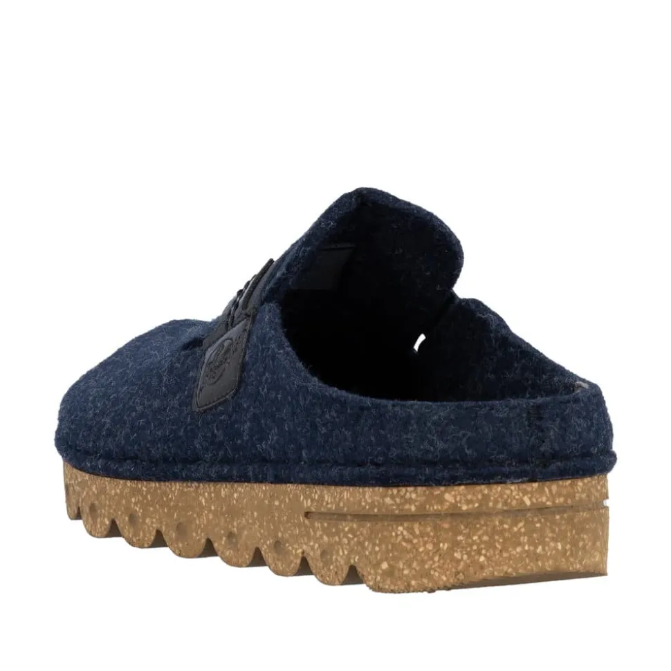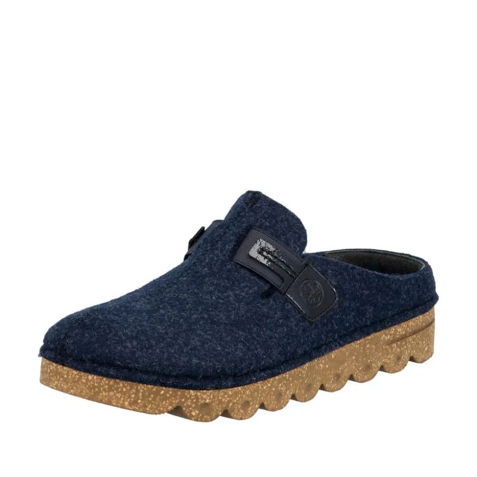 Rieker hjemmesko til dame i blå. Praktisk og komfortabel hjemmesko i filt materiale, der holder fødderne varme. Modellen har elastik, som sikrer en god pasform, og den er uden hælkappe, hvilket gør hjemmeskoen nem at komme i og af. Indvendigt finder du en blød sål, der giver behagelig komfort, mens kork ydersålen med mønster giver øget skridsikkerhed.
