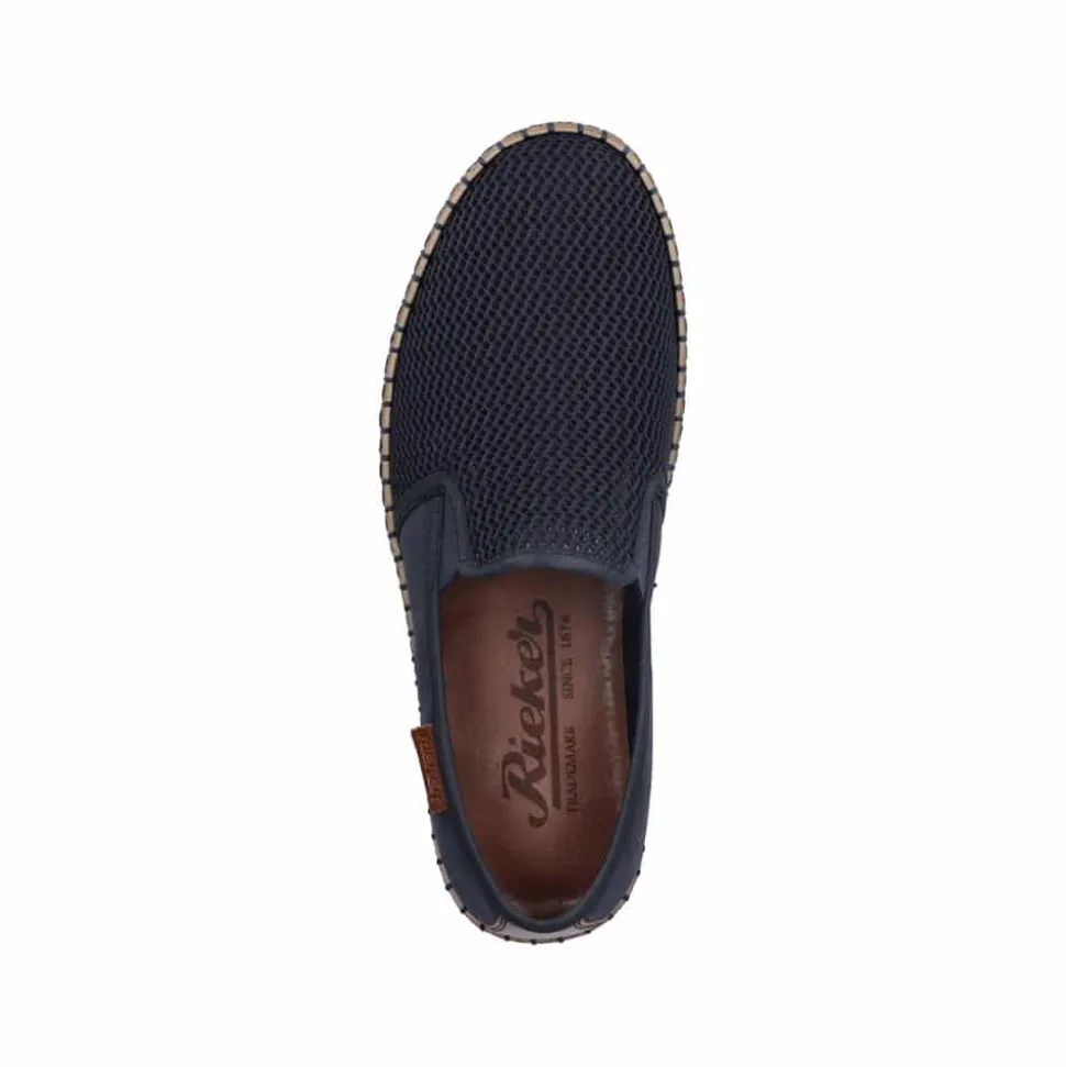 Rieker hyttesko til herre i blå. Glid ubesværet ind i denne hyttesko fra Rieker, udstyret med en indlægssål i ægte læder for øget komfort. Denne hyttesko har elastik på siderne, hvilket gør det lettere at tage dem af og på. De flotte blå syninger hele vejen rundt på skoen kombineret med en gummisål med stødabsorberende funktion forstærker komforten ved hvert skridt. De elegante netdetaljer på forsiden af skoen tilføjer et tidløst udseende.