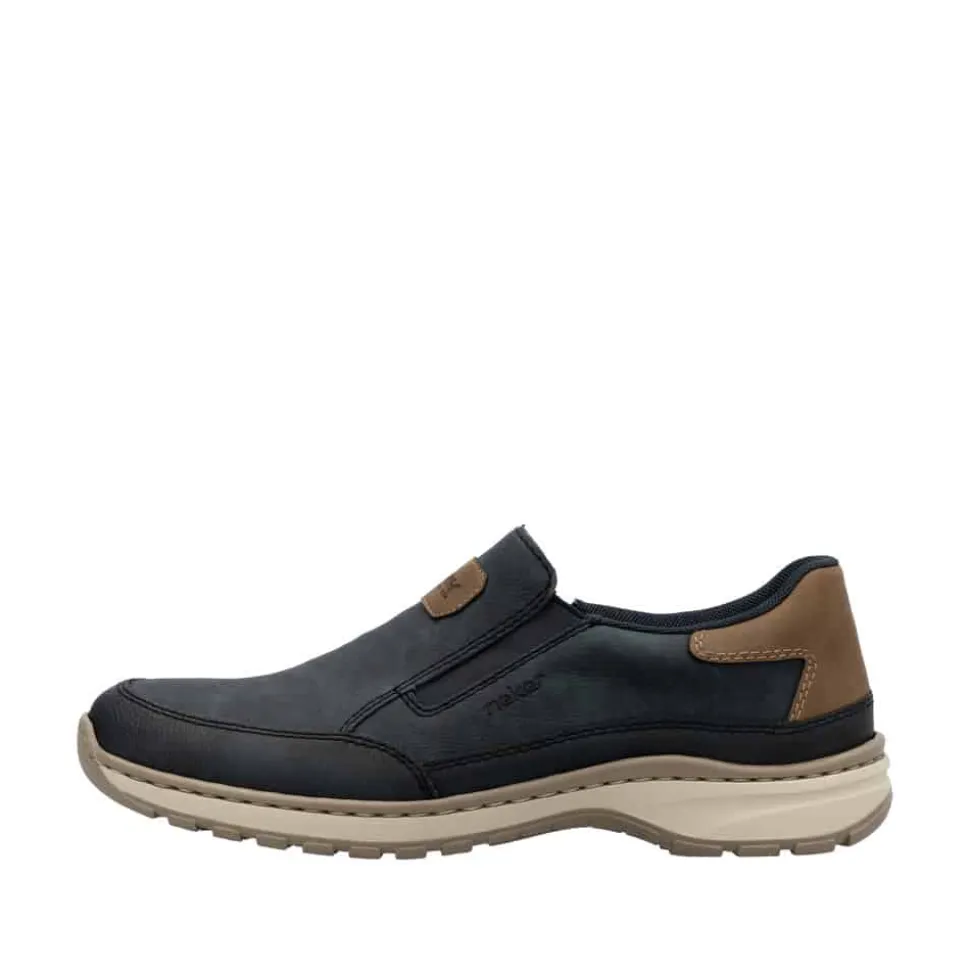 Rieker hyttesko til herre i blå. Disse blå Rieker hyttesko har den perfekte kombination stil og komfort. Den fleksible og slidstærke konstruktion giver en fremragende pasform, mens elastikken ved åbningen gør dem nemme at tage på og tilpasser sig foden. Den lette og stødabsorberende PU-sål sikrer en behagelig gang hele dagen, selv på lange ture. Den udtagelige indersål giver mulighed for personlig tilpasning, og den ekstra brede pasform (H) sørger for god plads til forfoden. En stilfuld og funktionel sko til enhver lejlighed.