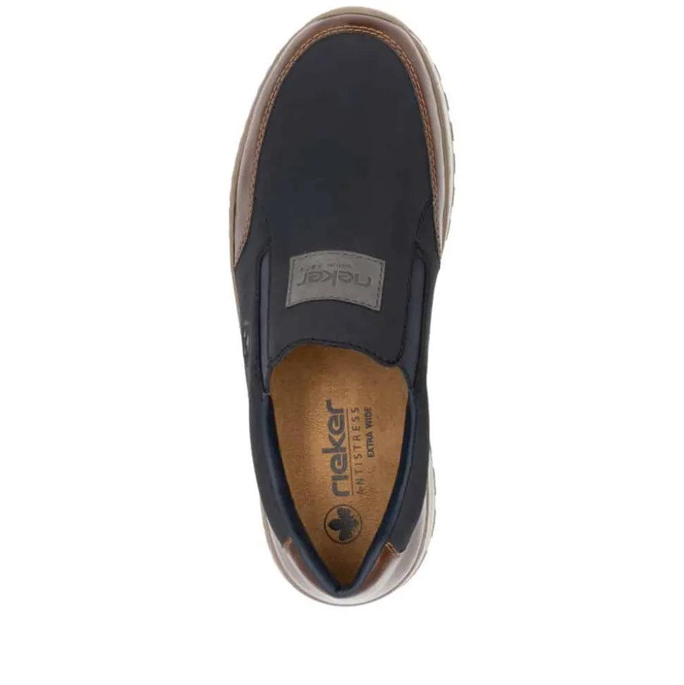 Rieker hyttesko til herre i blå. Træd ind i komforten med denne fleksible hyttesko i en smuk blå nuance. Den stødabsorberende sål sikrer en behagelig gangoplevelse, og den ekstra vidde H giver dig god plads i skoen, ideel til bredere fødder. Elastikken i åbningen og læderdetaljerne på fronten og hælkappen giver både funktion og stil – perfekt til hverdagens udfordringer.