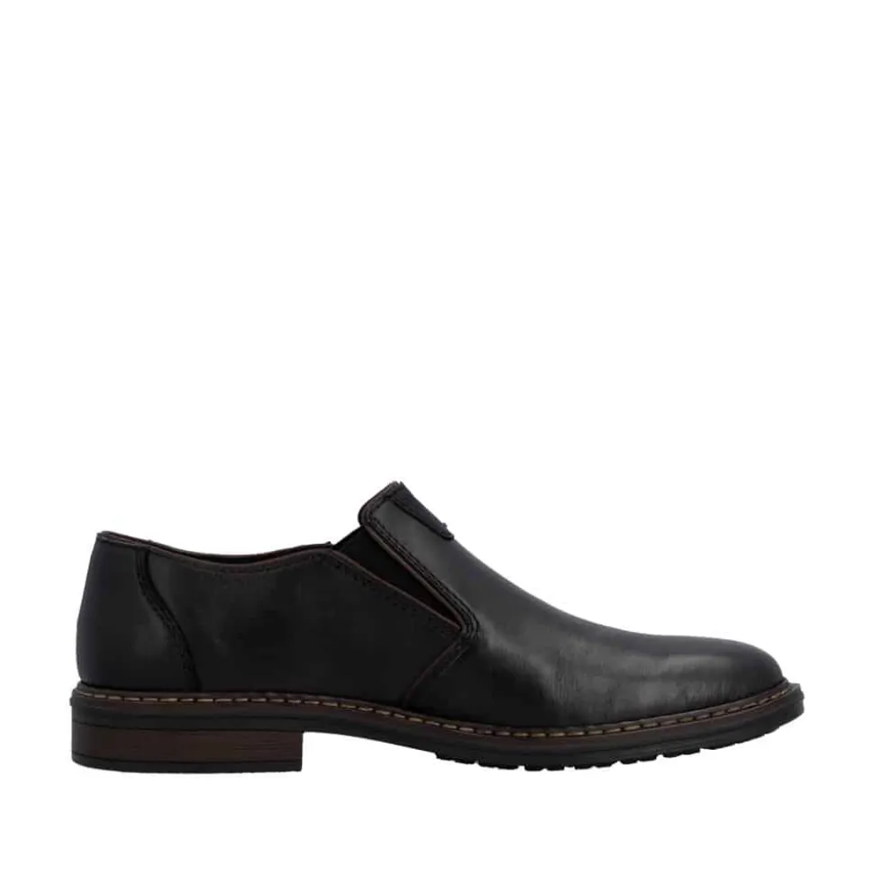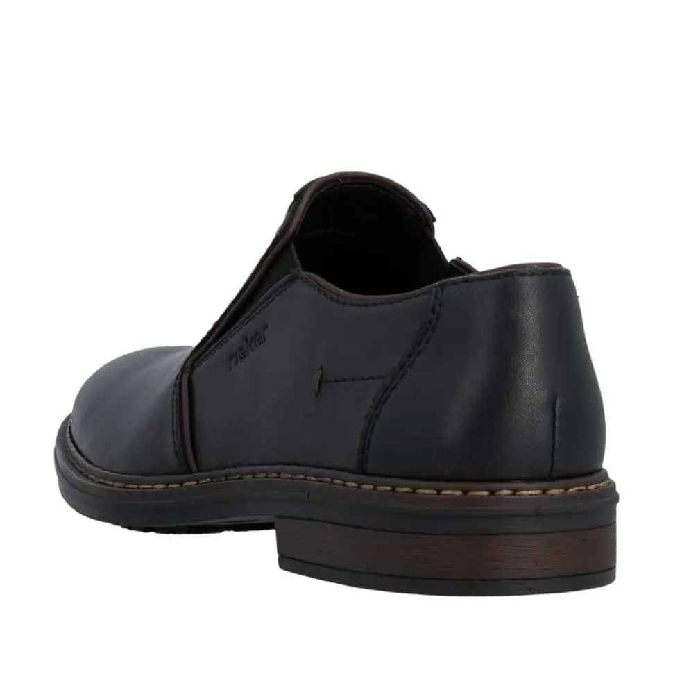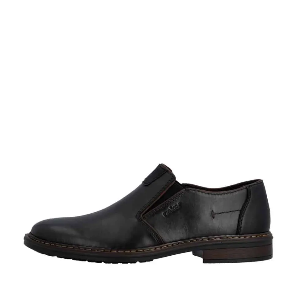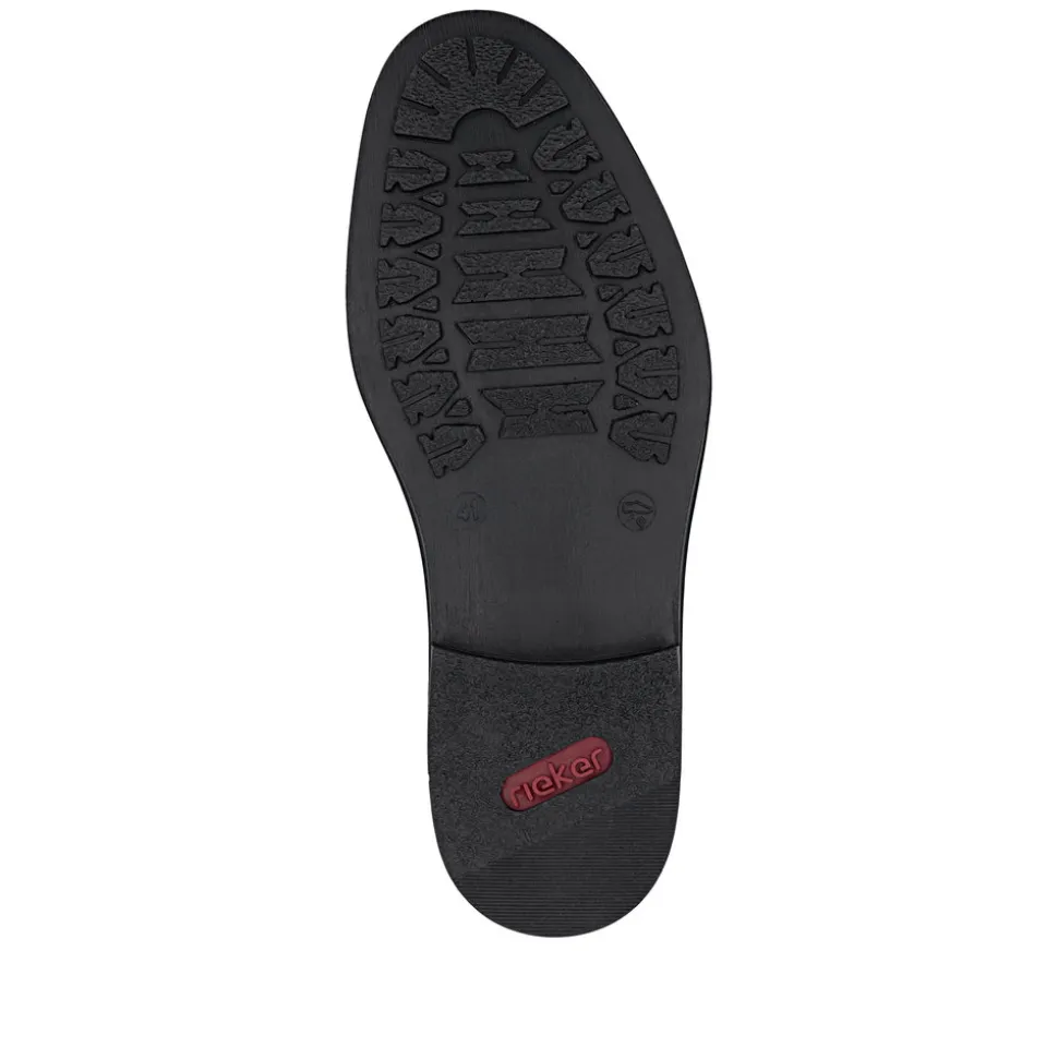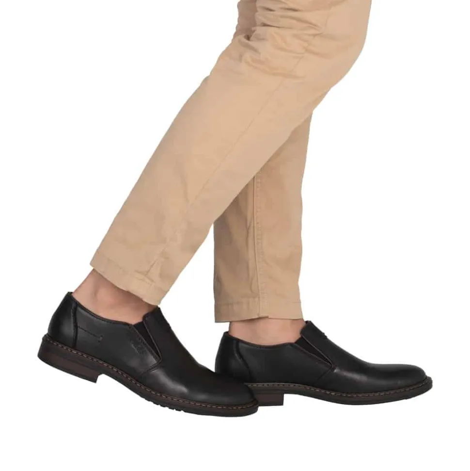 Rieker hyttesko til herre i sort. Denne flotte sko med skindoverdel er et alsidigt valg, der passer perfekt til både hverdag og finere begivenheder. Skoen har elastik, som gør den let at komme i og af og samtidig giver en behagelig pasform. Indvendigt er skoen udstyret med en blød skindsål, der sikrer god komfort hele dagen, mens ekstra bredde (H) giver god rummelighed til foden. Ydersålen er designet med et mønster, som giver øget stødabsorbering og skridsikkerhed i hverdagen.