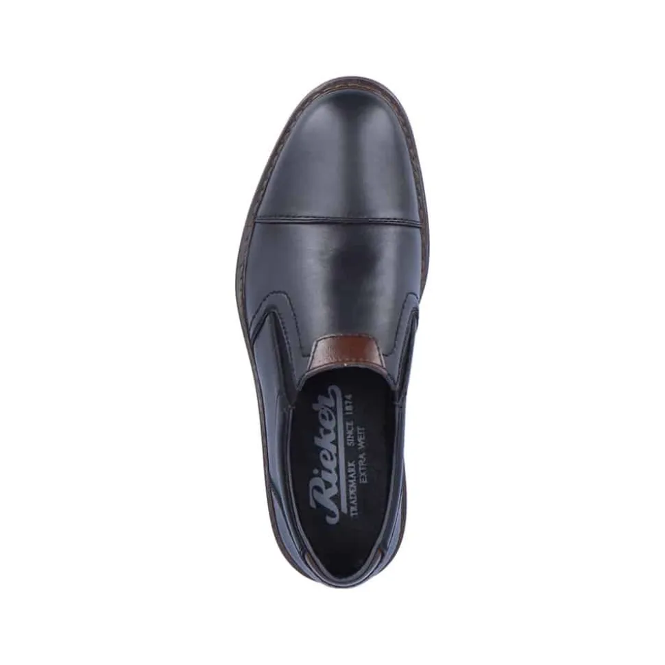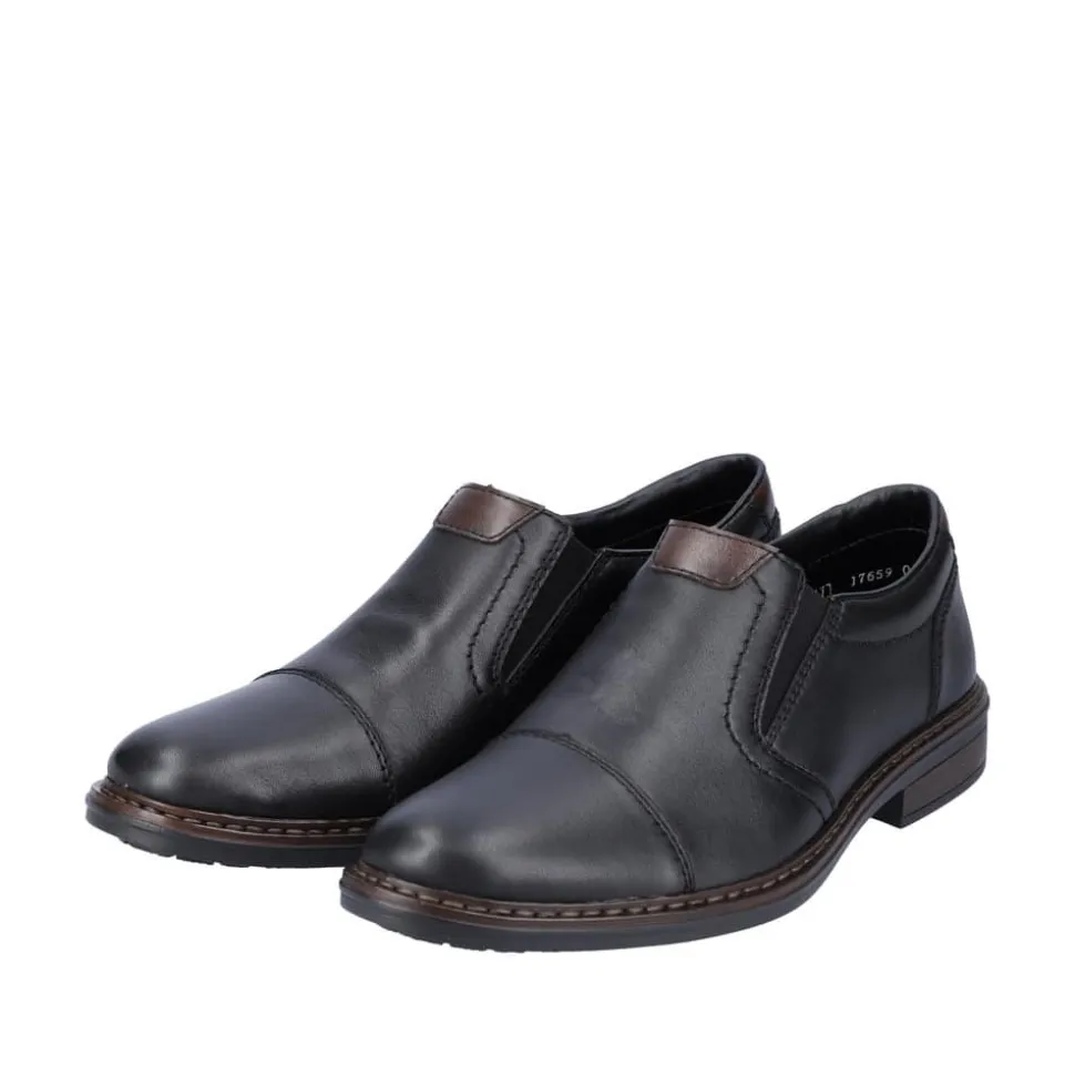 Rieker hyttesko til herre i sort. Populær hyttesko i en elegant sort farve med flotte detaljer der giver et moderne look. Skoen har en blød overdel i skind og er designet med elastik for en optimal pasform. Indvendigt bliver du mødt af en blød indersål der er designet med ekstra bredde H, der giver god rummelighed og øget komfort. Skoens har Rieker-Antistress, hvilket sikrer en let og fleksibel pasform, mens den stødabsorberende ydersål giver komfort hele dagen.