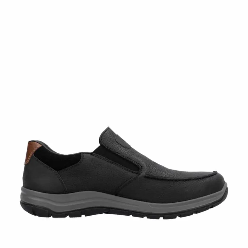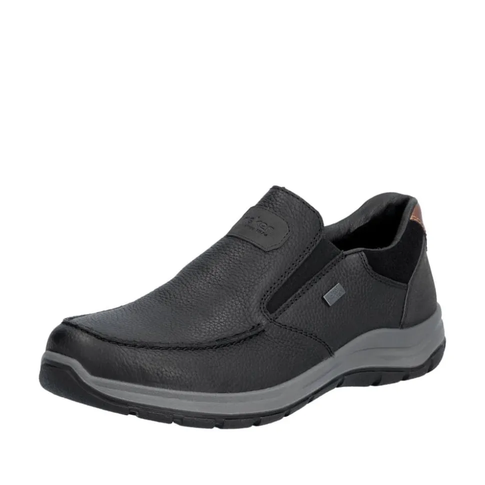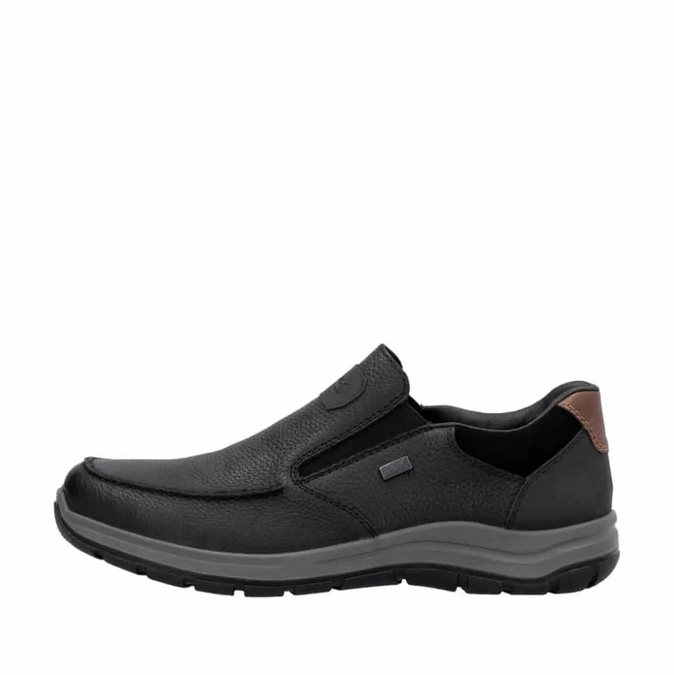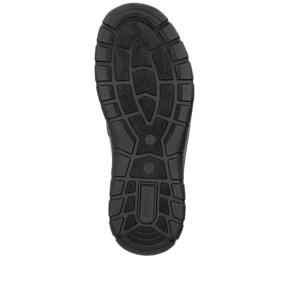Rieker hyttesko til herre i sort. Elegant og praktisk hyttesko med en sort skindoverdel, der løfter kvaliteten og udseendet på skoen. De to elastikker gør det let at tage skoen af og på, hvilket sikrer en hurtig og nem pasform. Skoen har flotte detaljer som Rieker logoet foran og brune detaljer bagpå, der giver et stilfuldt touch. Udstyret med Rieker-Tex er modellen vandafvisende, så dine fødder holdes tørre i al slags vejr. Indersålen er blød og kan tages ud, mens den ekstra vidde sikrer optimal komfort hele dagen. Den solide ydersål har et godt mønster, der giver ekstra skridsikkerhed og støtte, sammen med Rieker Antistress-teknologien.