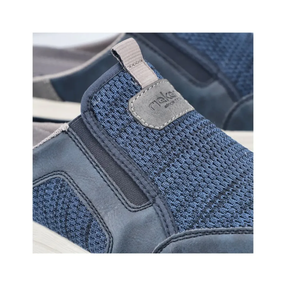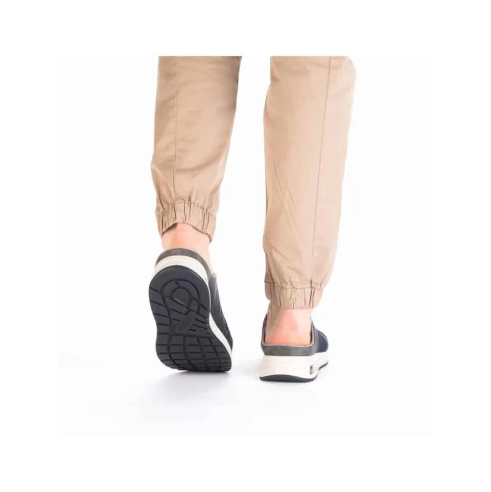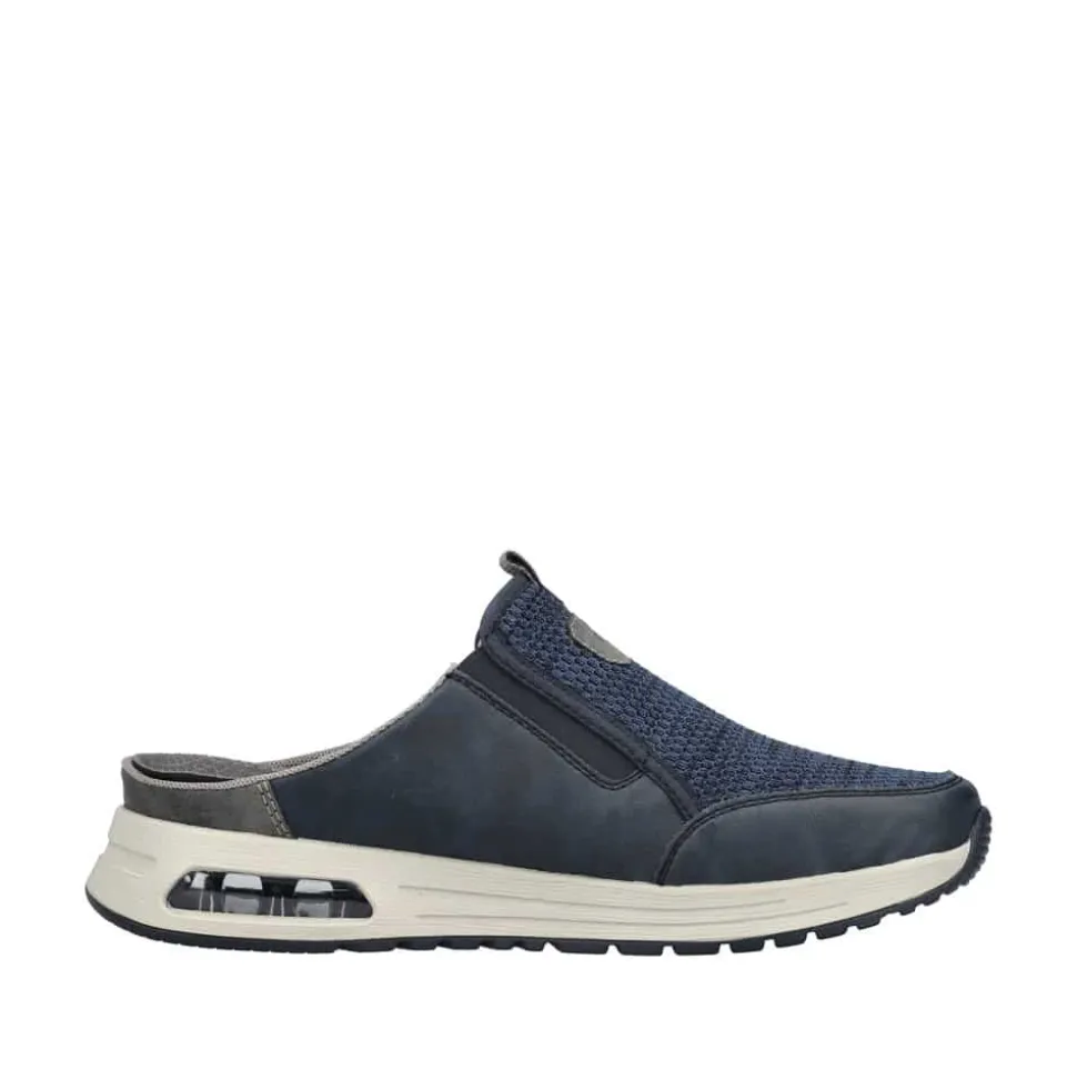 Rieker hyttesko til herre i blå. Funktionel og stilfuld. Denne blå Rieker-hyttesko til mænd med elastisk indlæg gør på- og aftagning af sandalen hurtig og nem. Med den lette, stødabsorberende sål og den polstrede, udtagelige indersål får du den bedste komfort hele dagen. Den komfortvidde G giver ekstra plads til bredere fødder, mens Rieker Air i hælen tilføjer både et moderne look og en blød stødabsorbering.