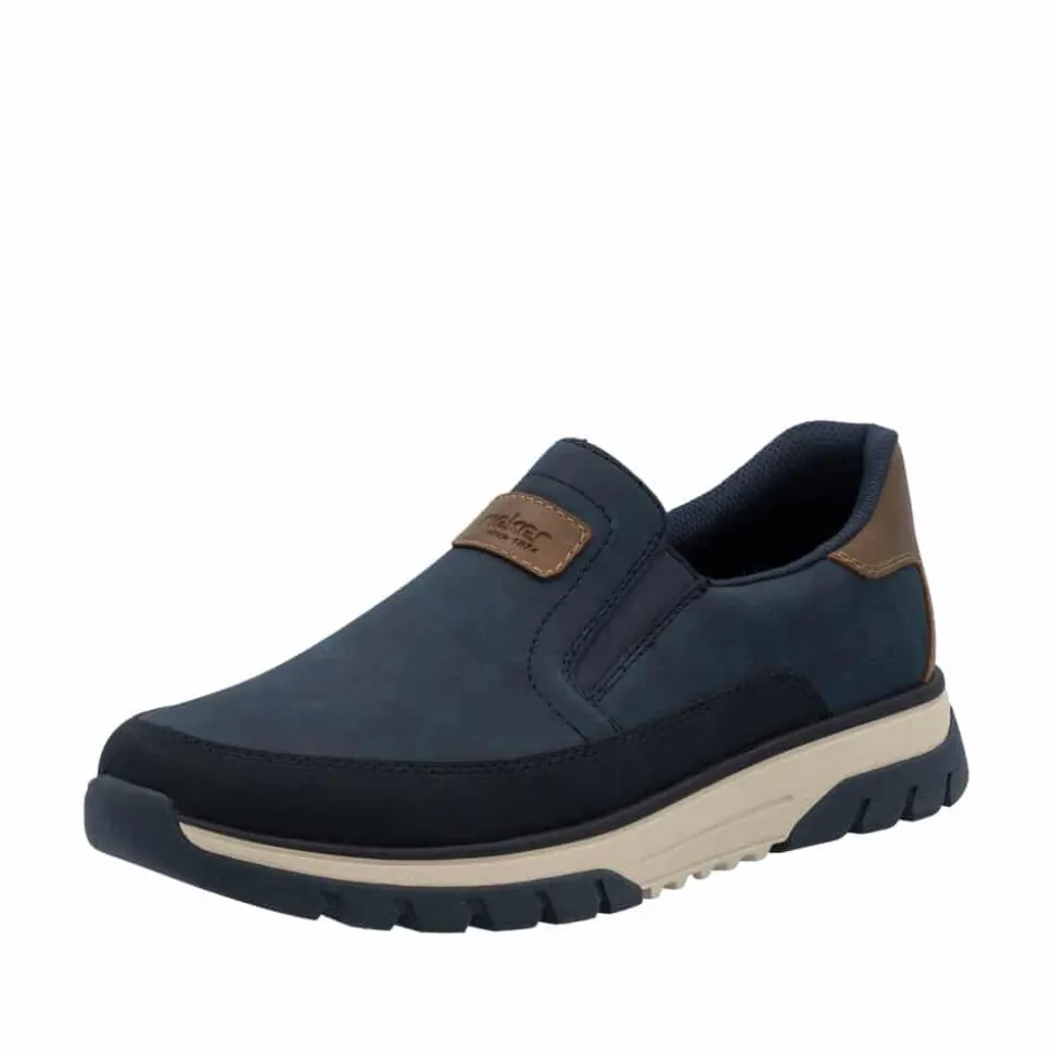 Rieker hyttesko til herre i blå. Disse blå Rieker hyttesko kombinerer stil og komfort i ét design. Skoene har elastik ved åbningen, som gør dem lette at tage af og på og giver en god pasform omkring foden. Med Rieker Antistress føles skoene både lette og fleksible, selv efter mange timers brug. Indvendigt finder du en blød og udtagelig sål, som sikrer god komfort hele dagen. Den ekstra bredde (H) giver god plads og bevægelsesfrihed, mens den mønstrede ydersål øger både stødabsorbering og skridsikkerhed.