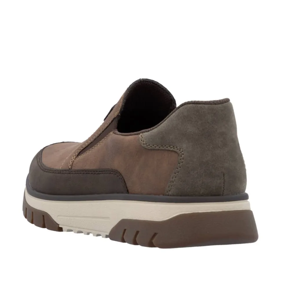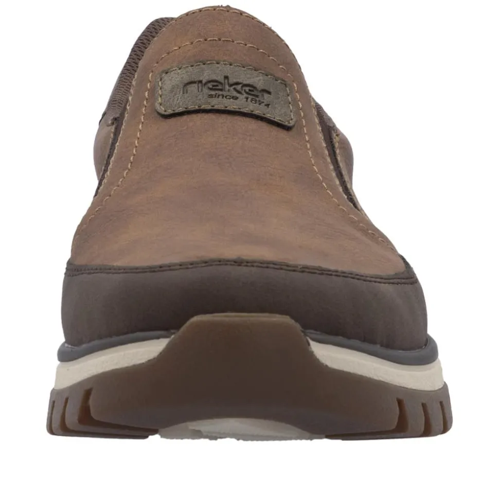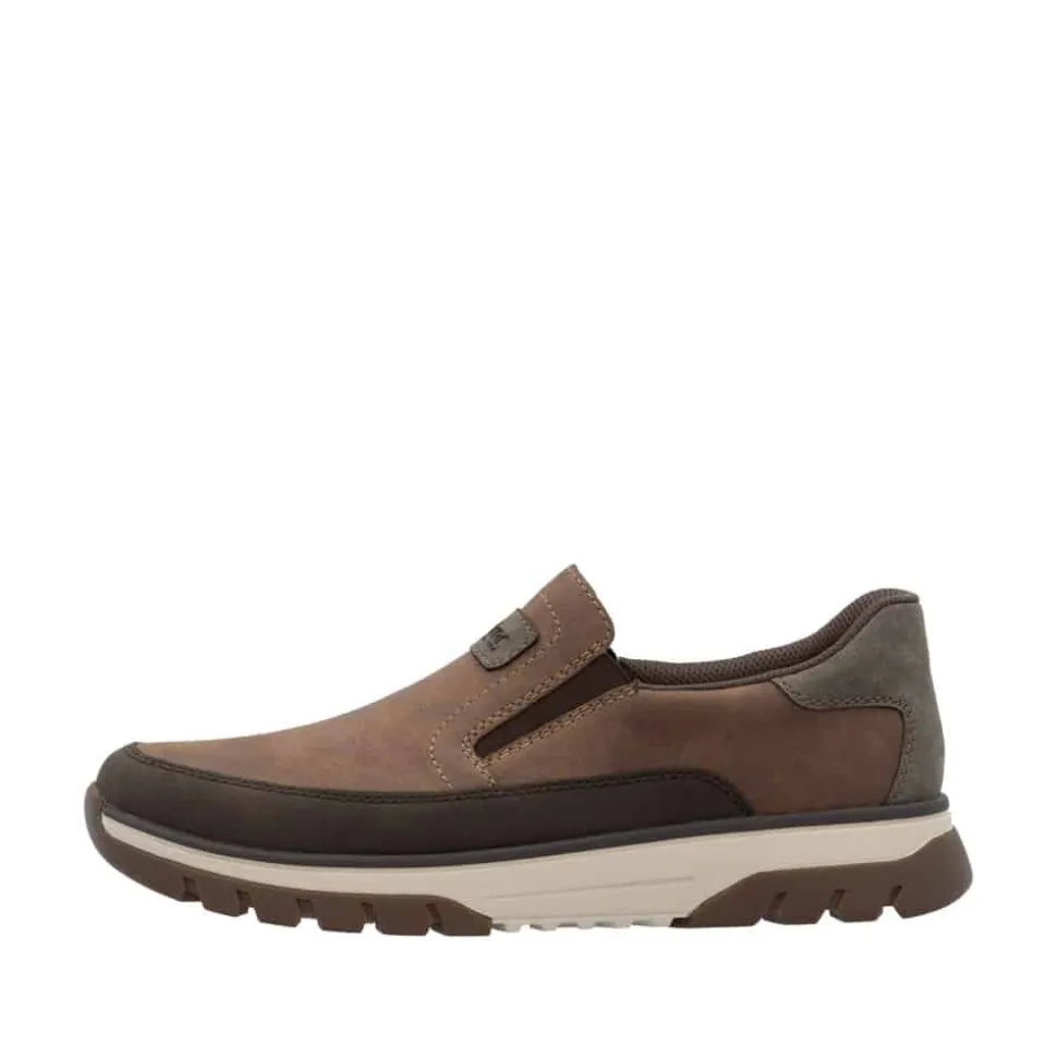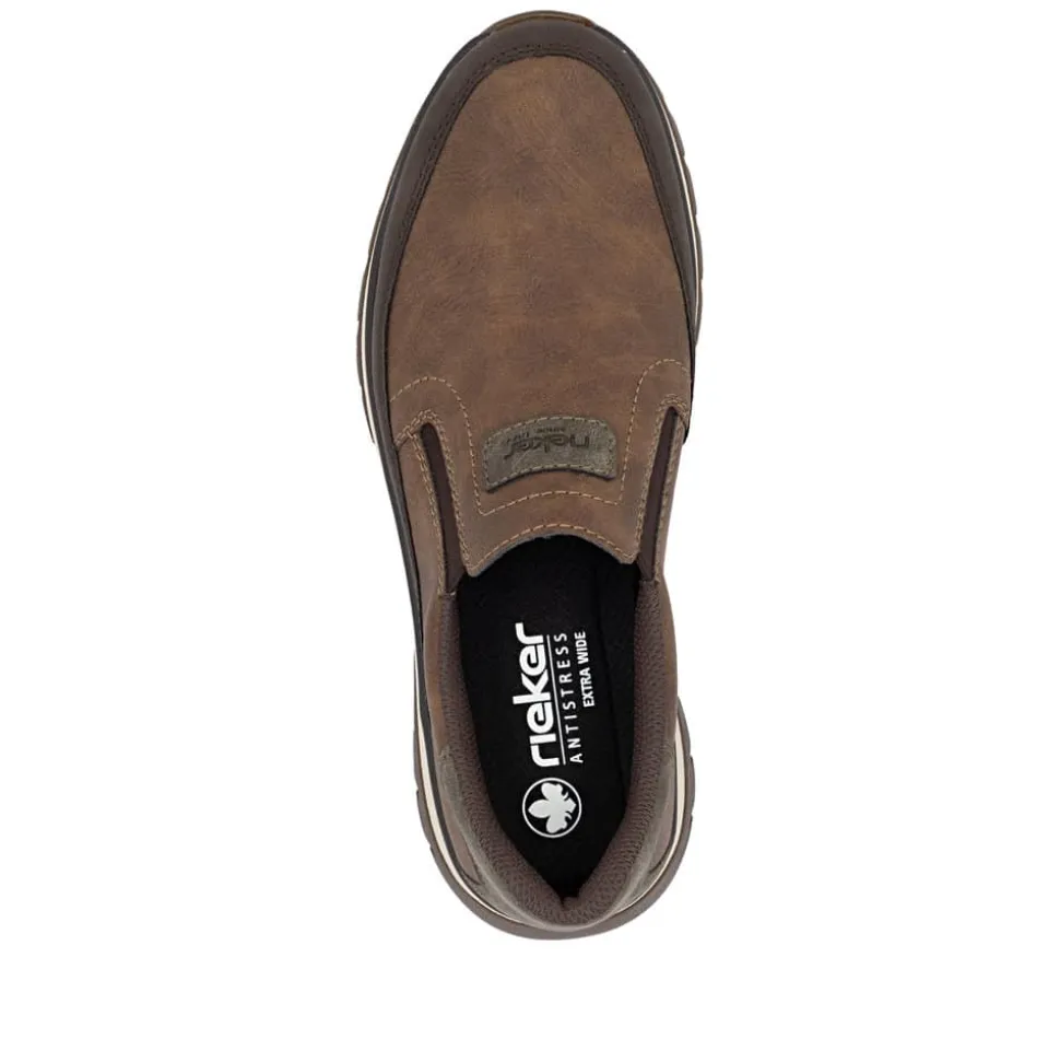 Rieker hyttesko til herre i brun. En klassisk brun Rieker sko med fokus på komfort og funktion. Elastikken omkring åbningen giver en fleksibel pasform og gør det nemt at tage skoen på. Indvendigt sikrer den udtagelige Rieker soft sål god komfort hele dagen, og den ekstra bredde (H) giver mere plads til foden. Takket være Rieker Antistress er skoen både let og fleksibel. Ydersålen er designet med mønster, der øger stødabsorbering og skridsikkerhed.