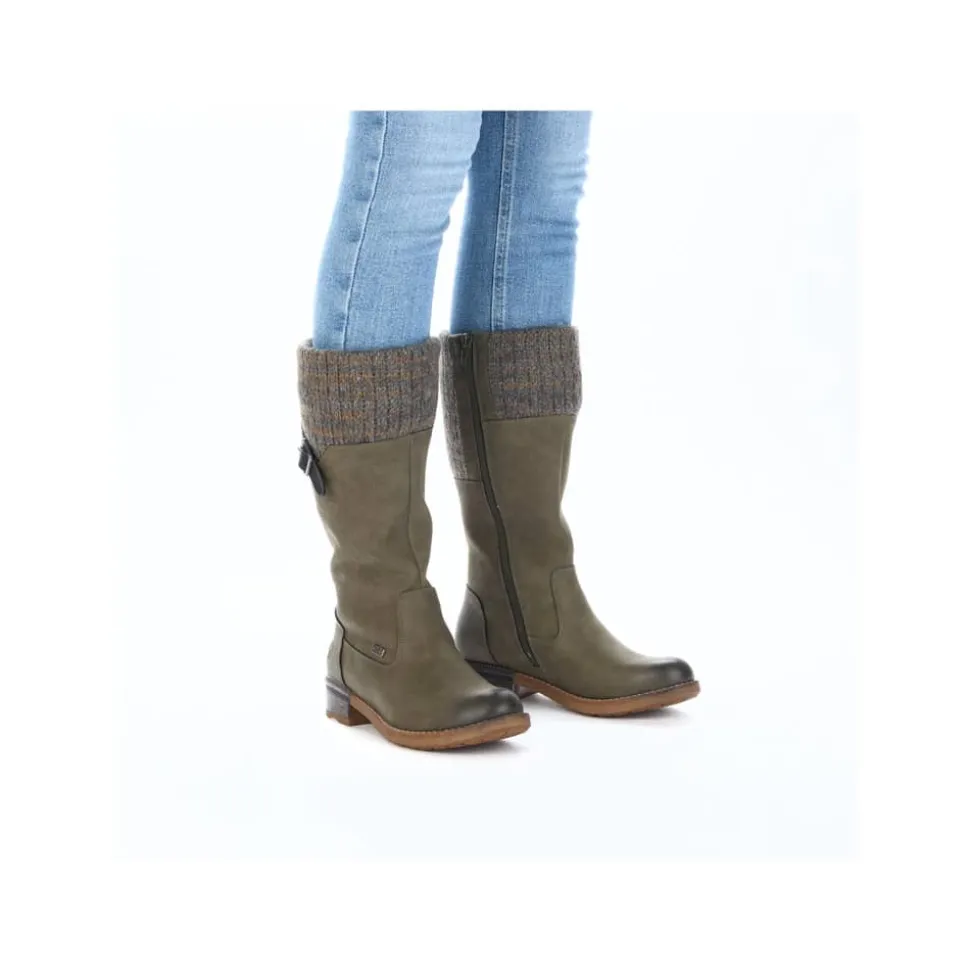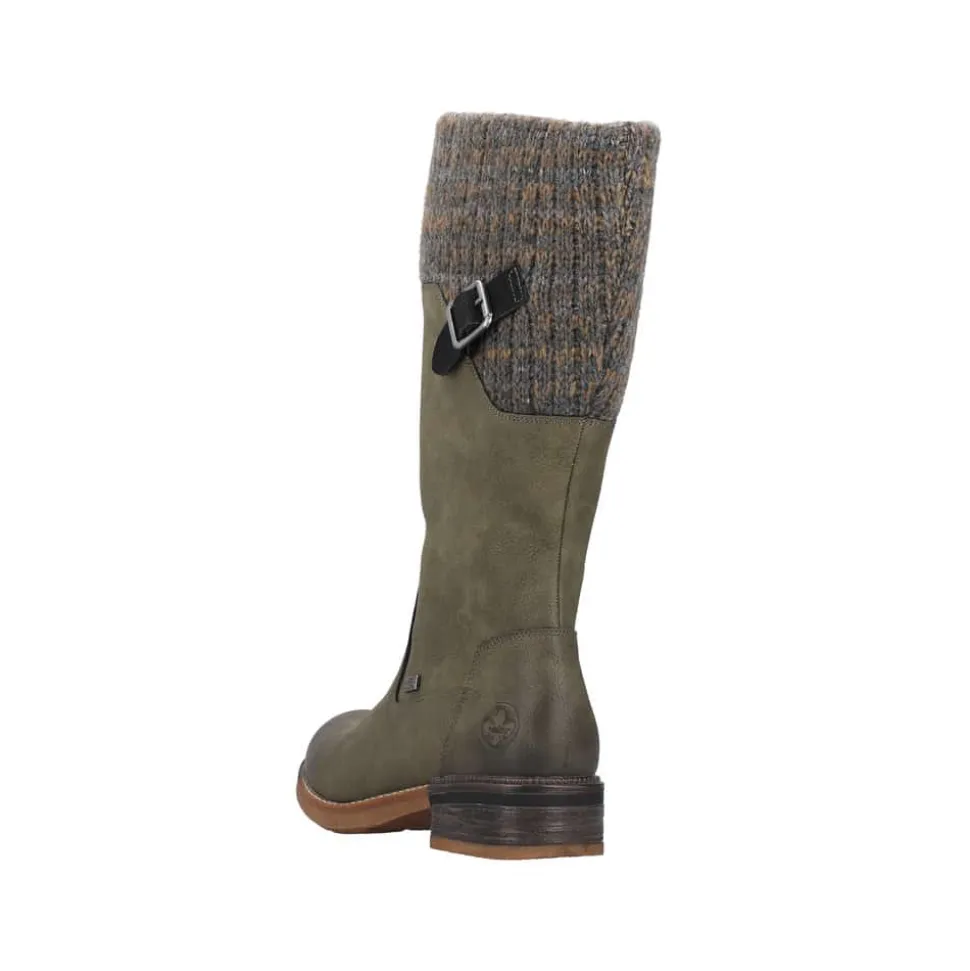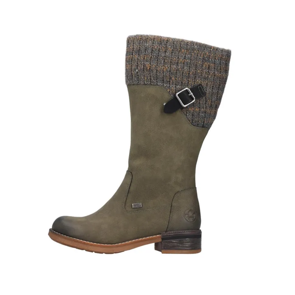 Rieker lang støvle til dame i grøn. Smart vinterstøvle i en moderne grøn farve med flotte detaljer, der giver et stilfuldt udtryk. Støvlen har en strikket krave og en spænde, som tilfører et moderne touch, mens lynlåsen på indersiden gør den nem at tage af og på. Indvendigt finder du en varm foring, der holder fødderne lune, og en blød indersål, som giver komfort hele dagen. Takket være Rieker-Tex er støvlen kraftigt vandafvisende, og den stødabsorberende ydersål med mønster giver god støtte og øget skridsikkerhed.