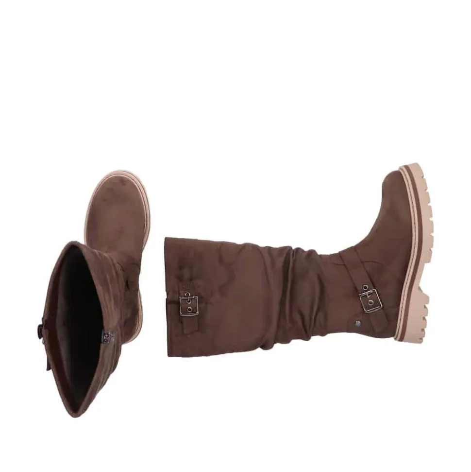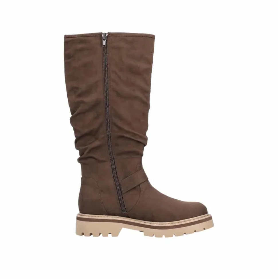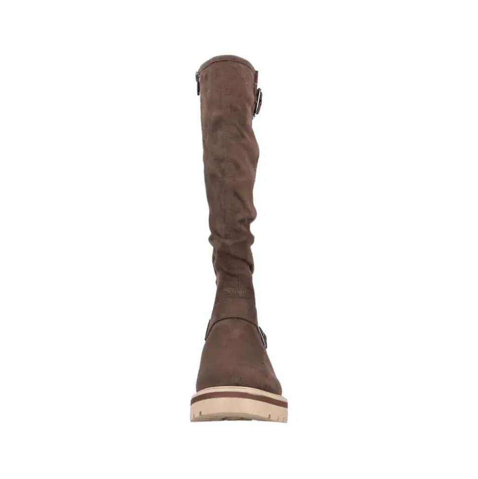 Rieker lang støvle til dame i brun. Stilfuld støvle i brun med flotte spænder og et langt skaft, der giver et moderne udtryk. Støvlen er udstyret med en funktionel lynlås på indersiden, som gør den nem at tage af og på. Indvendigt finder du en let foring og en blød sål, der sikrer høj komfort hele dagen. Den chunky ydersål med stødabsorberende egenskaber og et godt mønster giver øget støtte og skridsikkerhed.