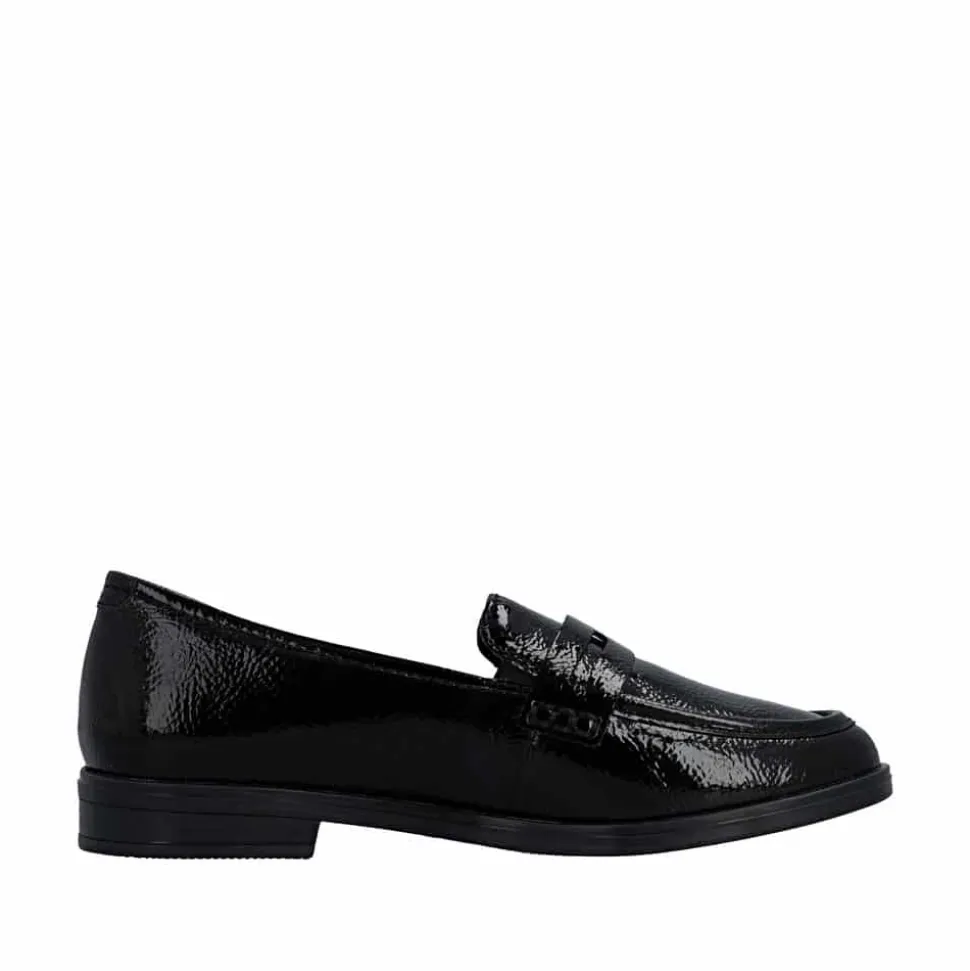 Rieker loafers til dame i sort lak. Denne elegante loafers har en flot lakoverdel og enkle detaljer som giver et pænt og moderne udtryk. Skoen er nem at tage på, da de to elastikker ved åbningen gør det let at komme i skoen og samtidig sikrer en god pasform. Indvendigt er skoen udstyret med en blød skindsål, og sammen med den stødabsorberende ydersål giver det god komfort hele dagen. Ydersålen har et tydeligt mønster som bidrager til stabilitet og øget skridsikkerhed.