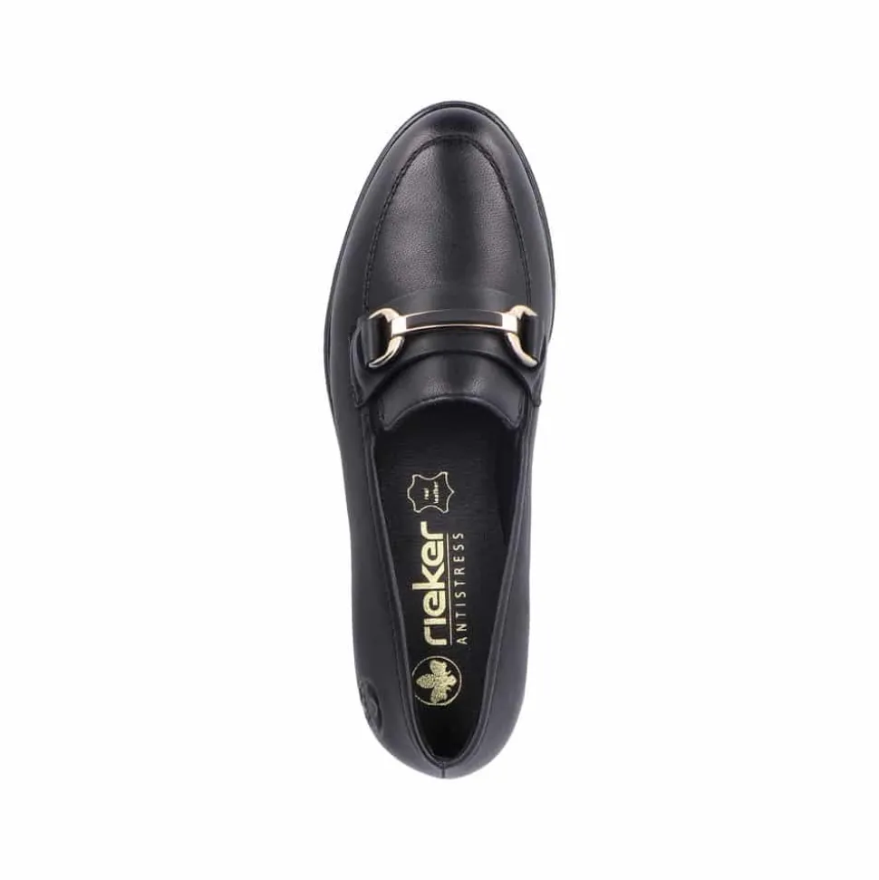 Rieker loafers til dame i sort. Denne elegante loafers kommer i en klassisk sort farve med fine detaljer. Skoen er lavet af 100% skind udvendigt og har en blød skind indersål. Modellen er let at tage på og har elastik for en god pasform. Den flotte guldkæde over forfoden tilføjer et ekstra strejf af stil. Med stødabsorberende såler sikres optimal komfort hele dagen. Skoen har også en lille hæl, som giver den et elegant udtryk. Den sorte ydersål har et godt mønster for øget skridsikkerhed.